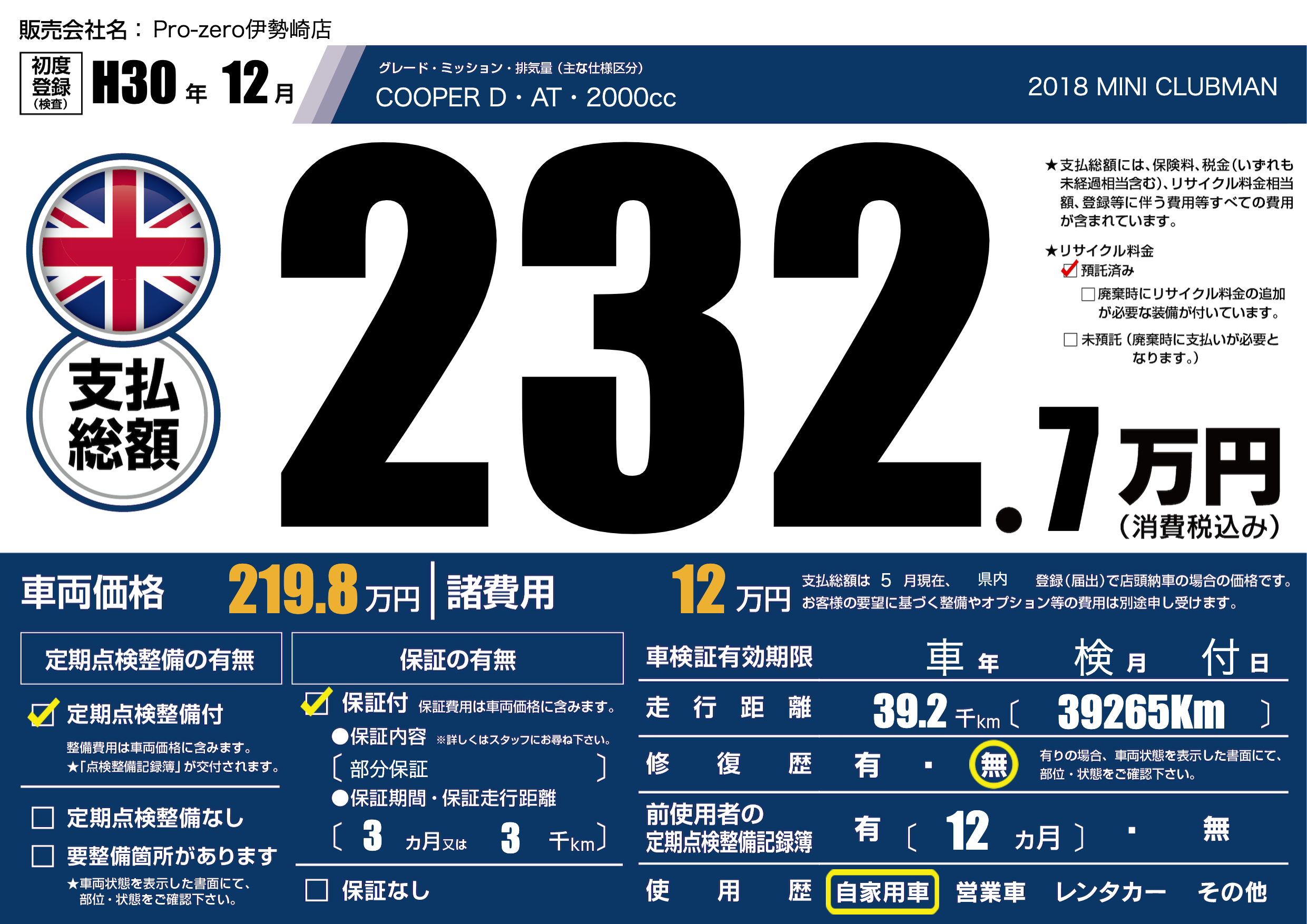 | 車名 | 2018 MINI CLUBMAN | グレード ミッション 排気量 |