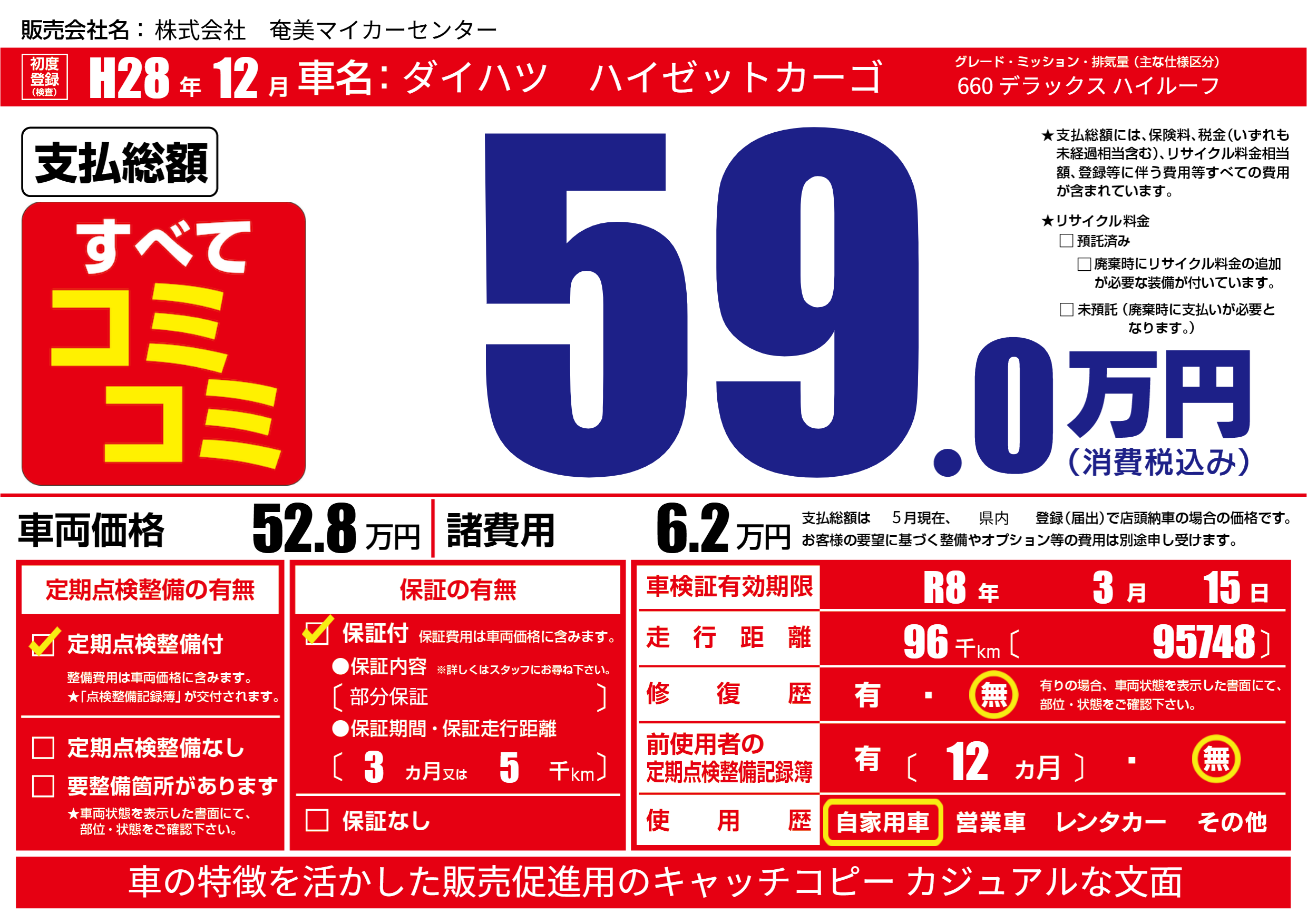 | 走行キロ | 9.6万km | 初年度登録 | H28年12月 |