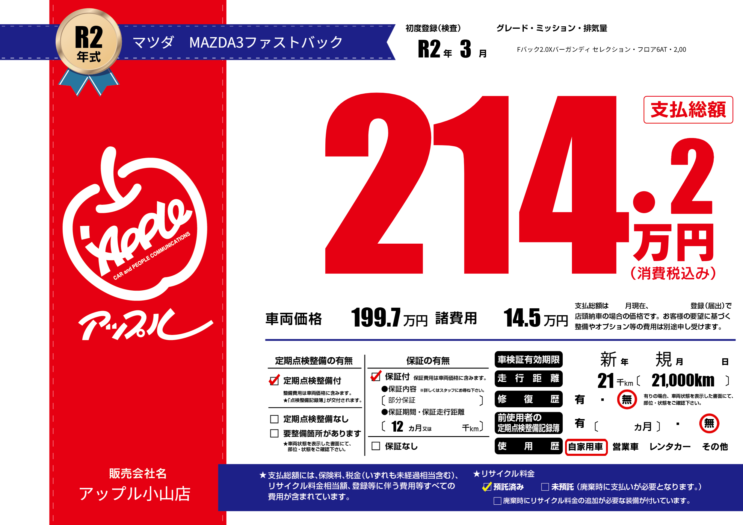 | 車名 | マツダ MAZDA3ファストバック | グレード ミッション 排気量 |