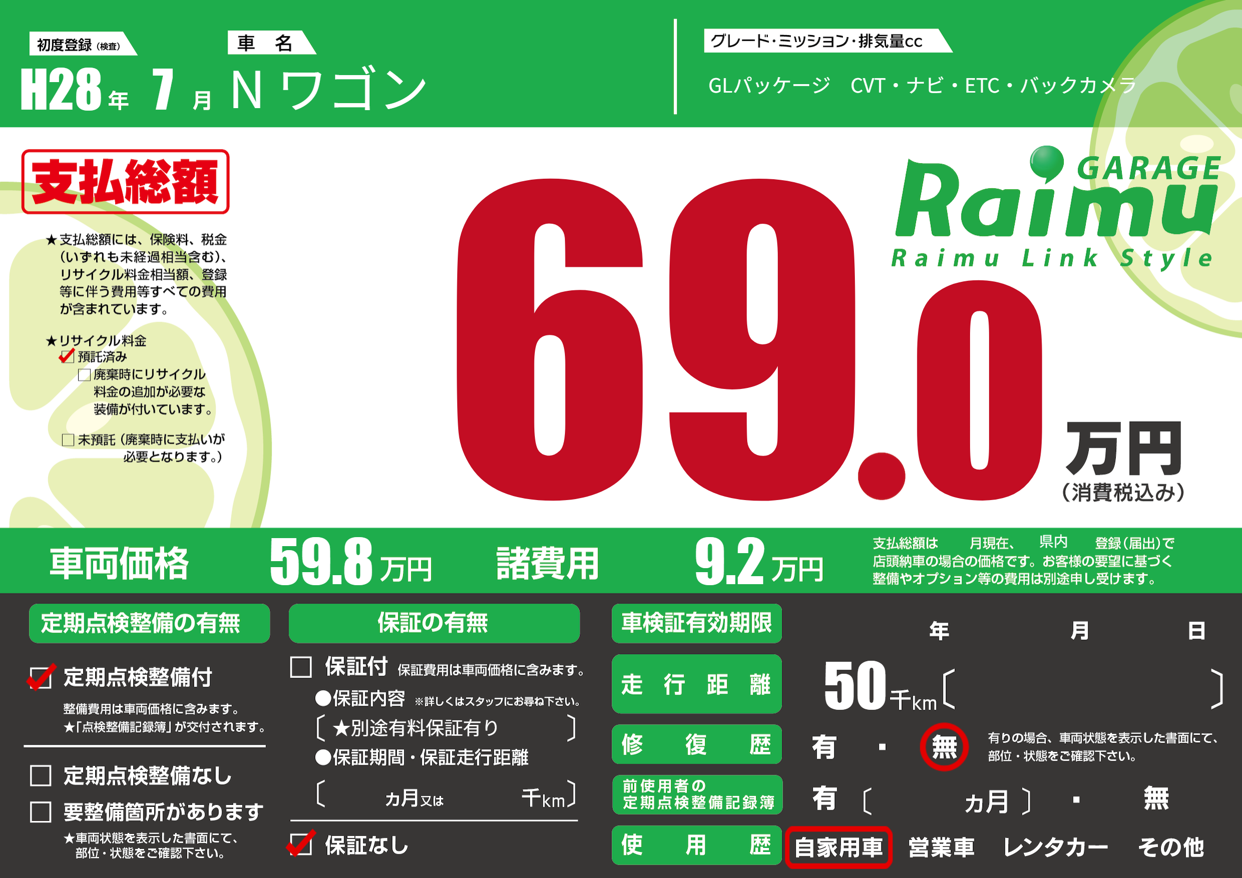 | 車名 | N ワゴン | グレード ミッション 排気量 |