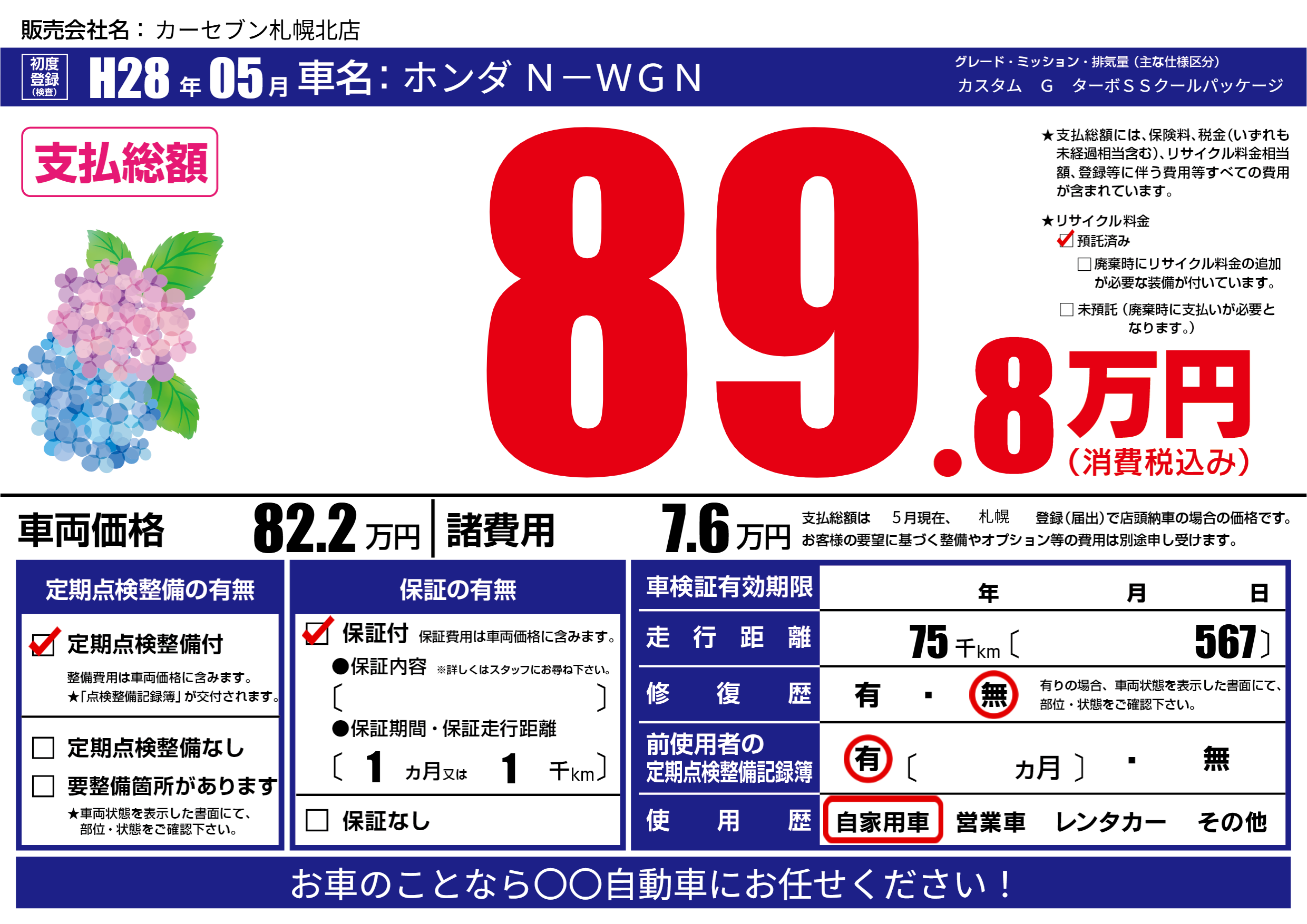 | 車名 | ホンダ N-WGN | グレード ミッション 排気量 |