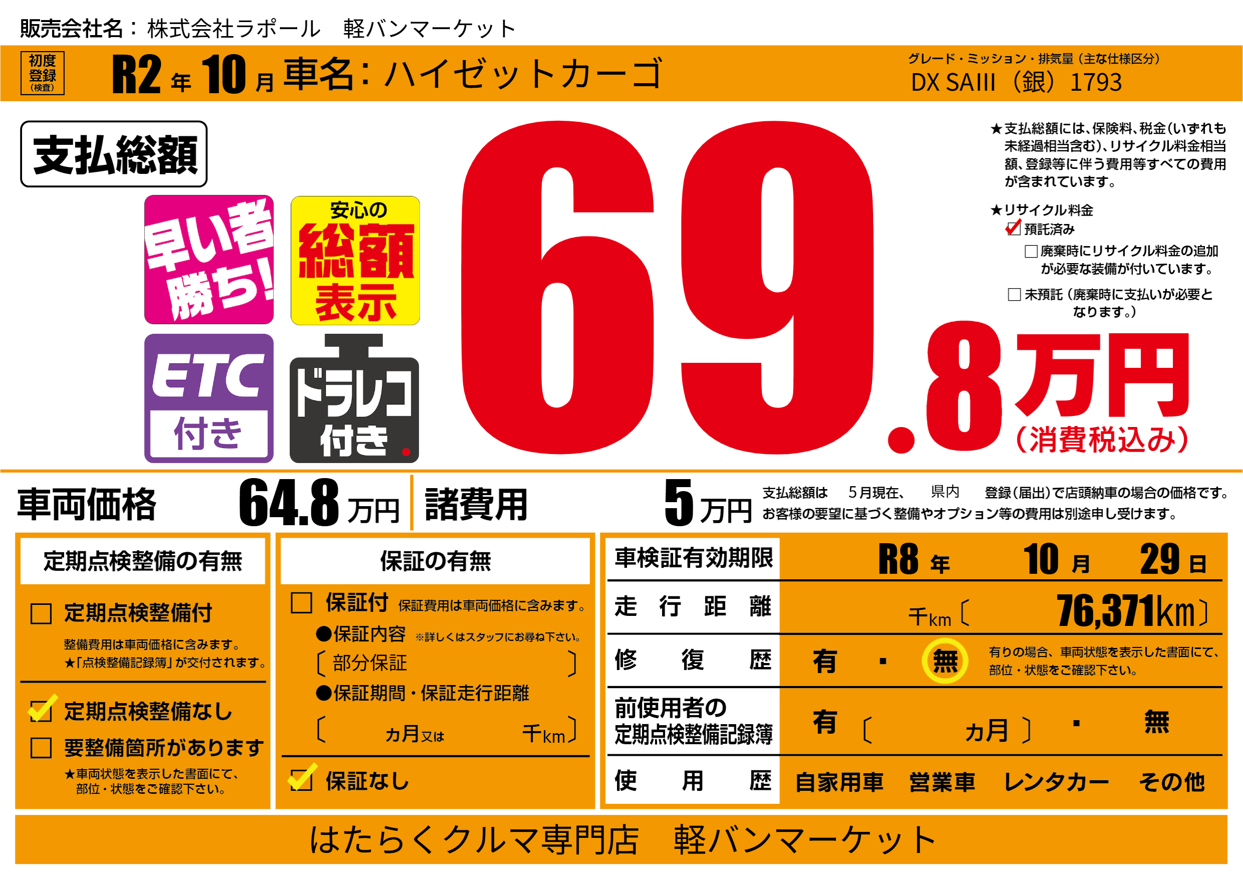 | 車検制限 | R8年 10月 29日 | ||