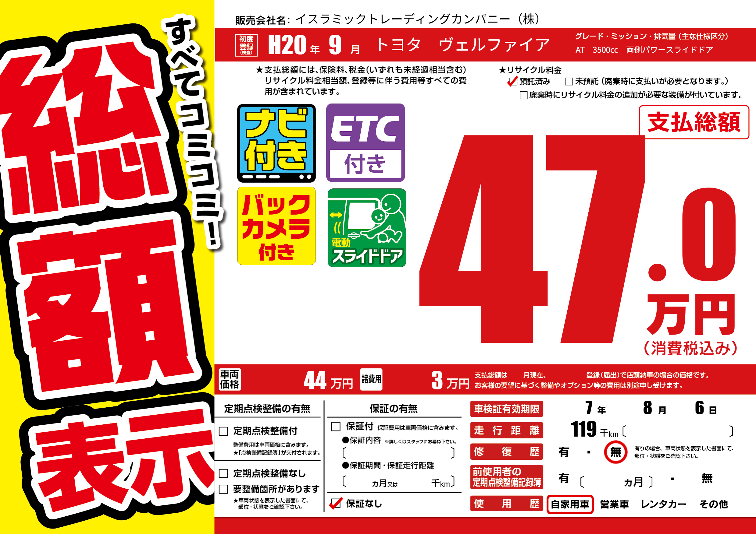 | 車名 | トヨタ ヴェルファイア | グレード ミッション 排気量 |