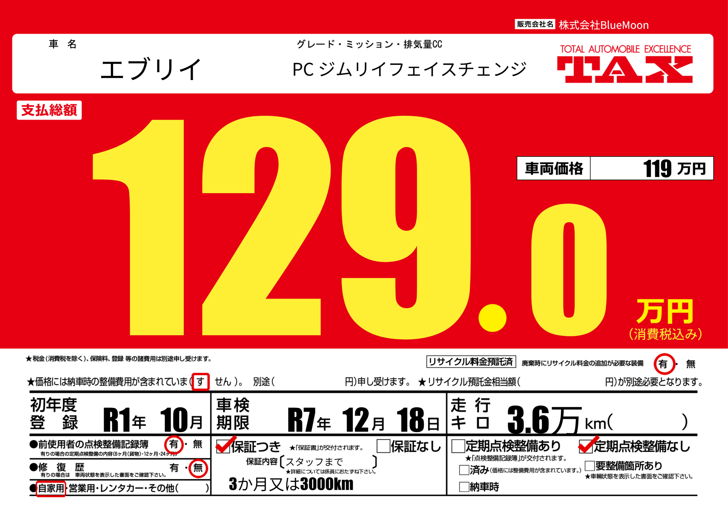 | 車名 | エブリイ | グレード ミッション 排気量 |