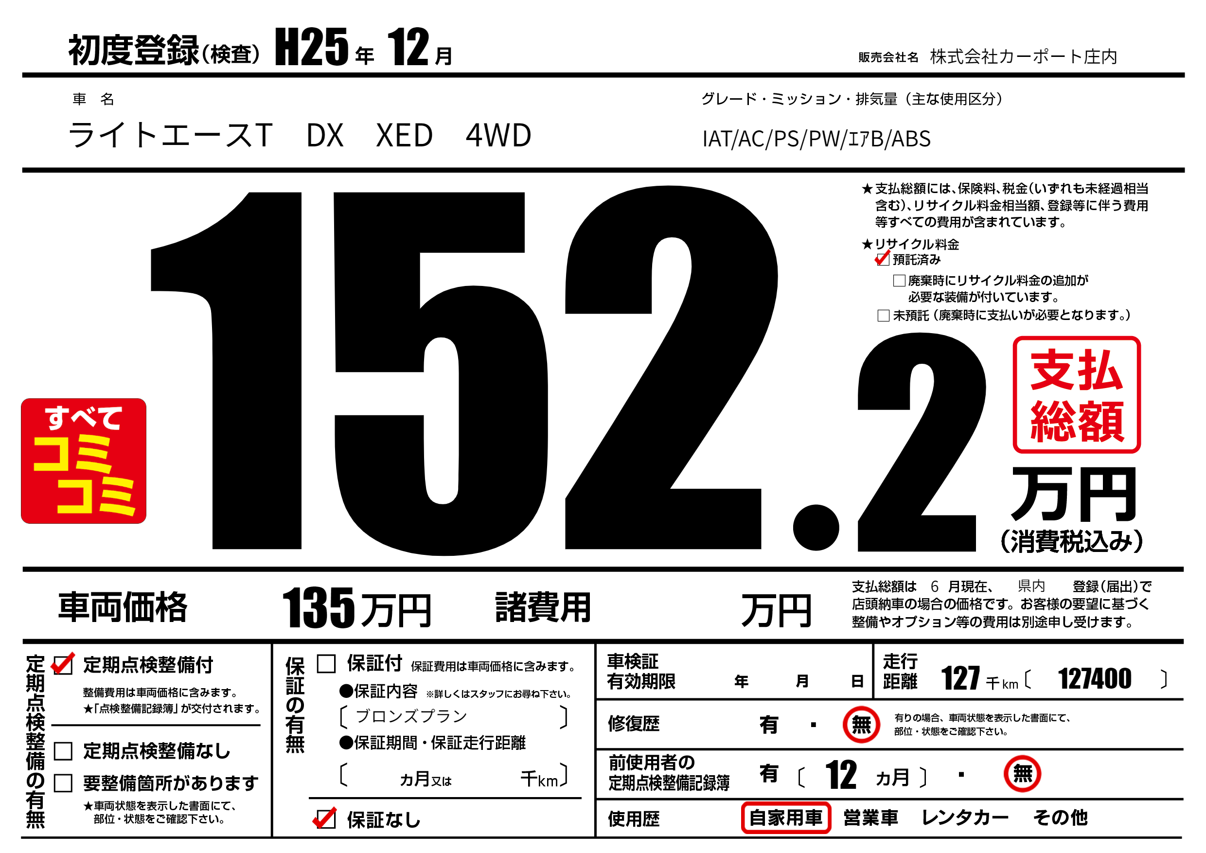 | 走行キロ | 12.7万km | 初年度登録 | H25年12月 |