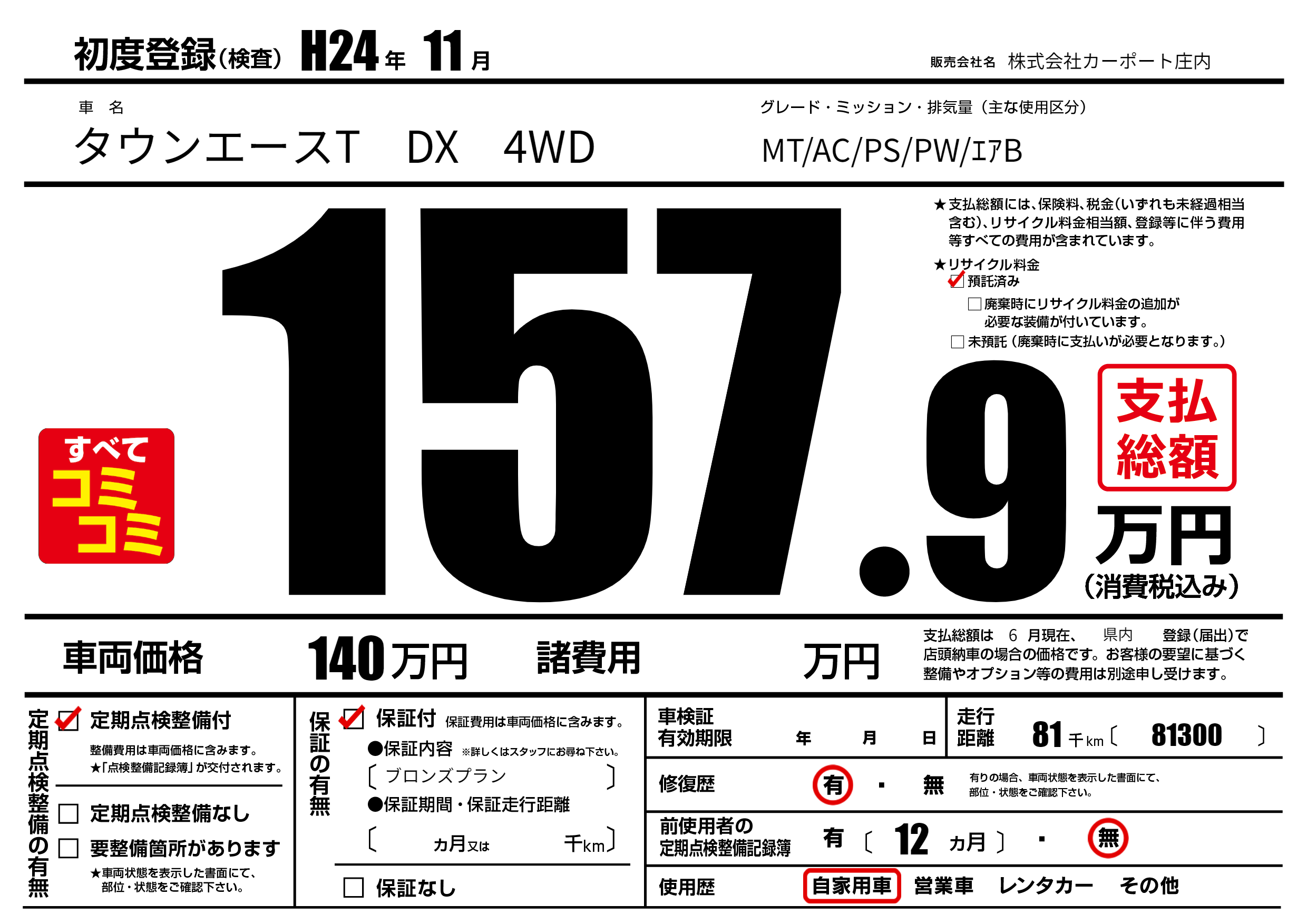 | 車名 | タウンエースT DX 4WD | グレード ミッション 排気量 |