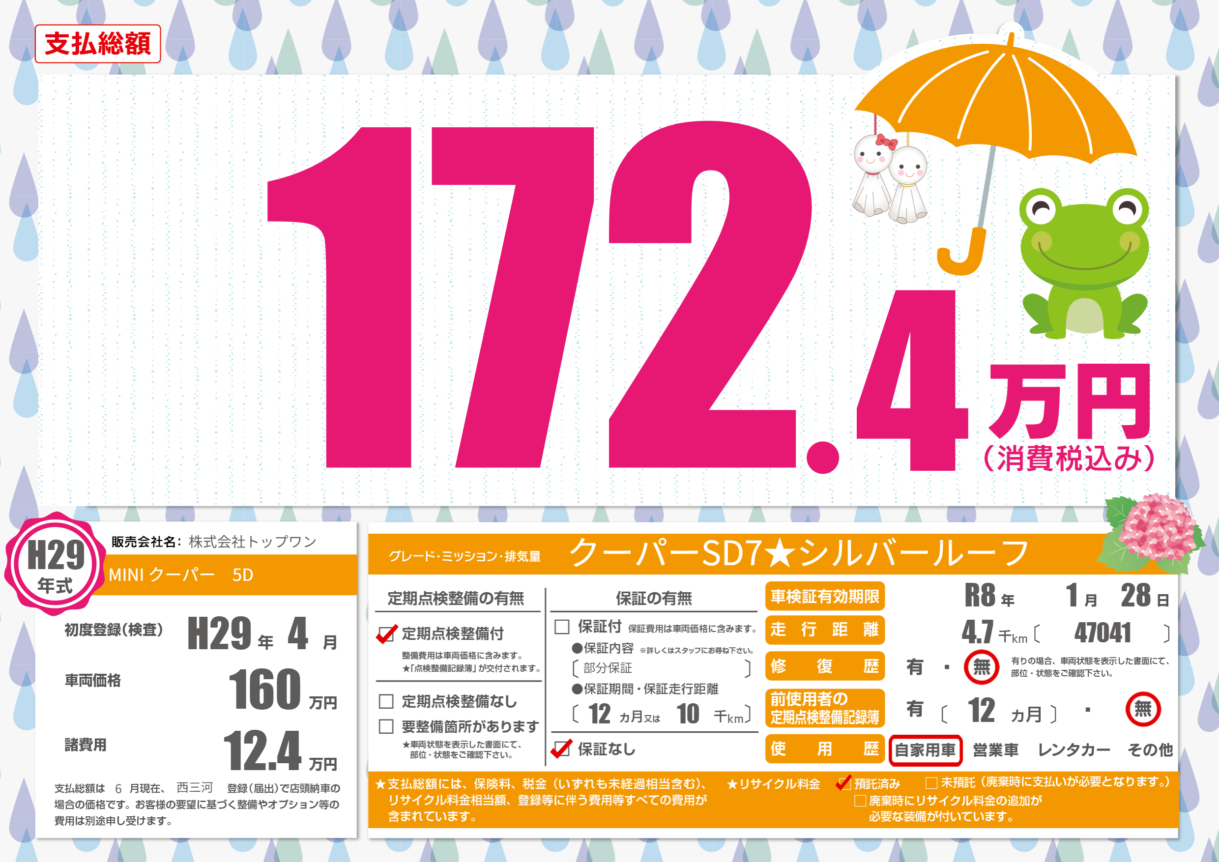 | 車名 | MINI クーパー 5D | グレード ミッション 排気量 |