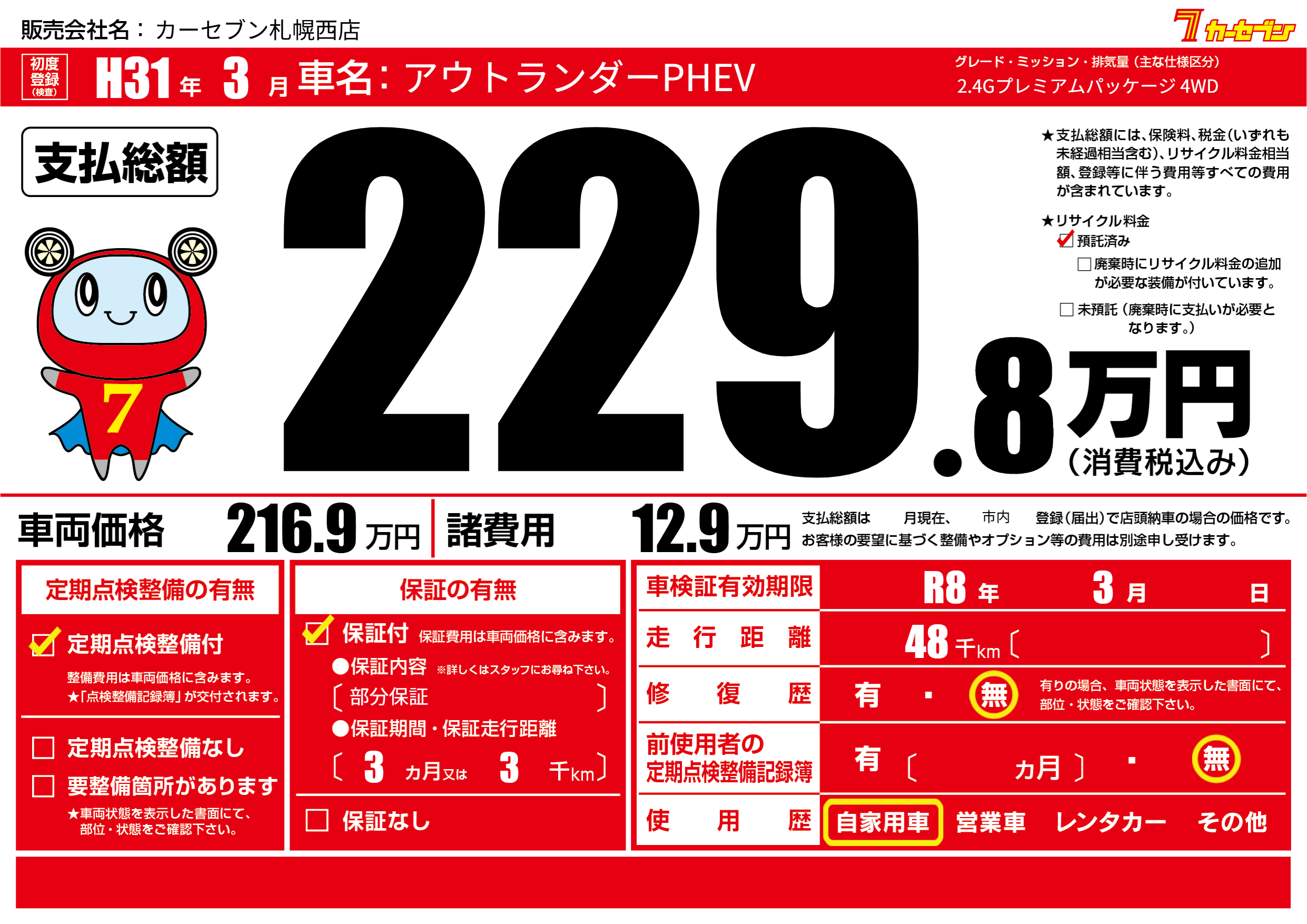 | 車名 | アウトランダーPHEV | グレード ミッション 排気量 |