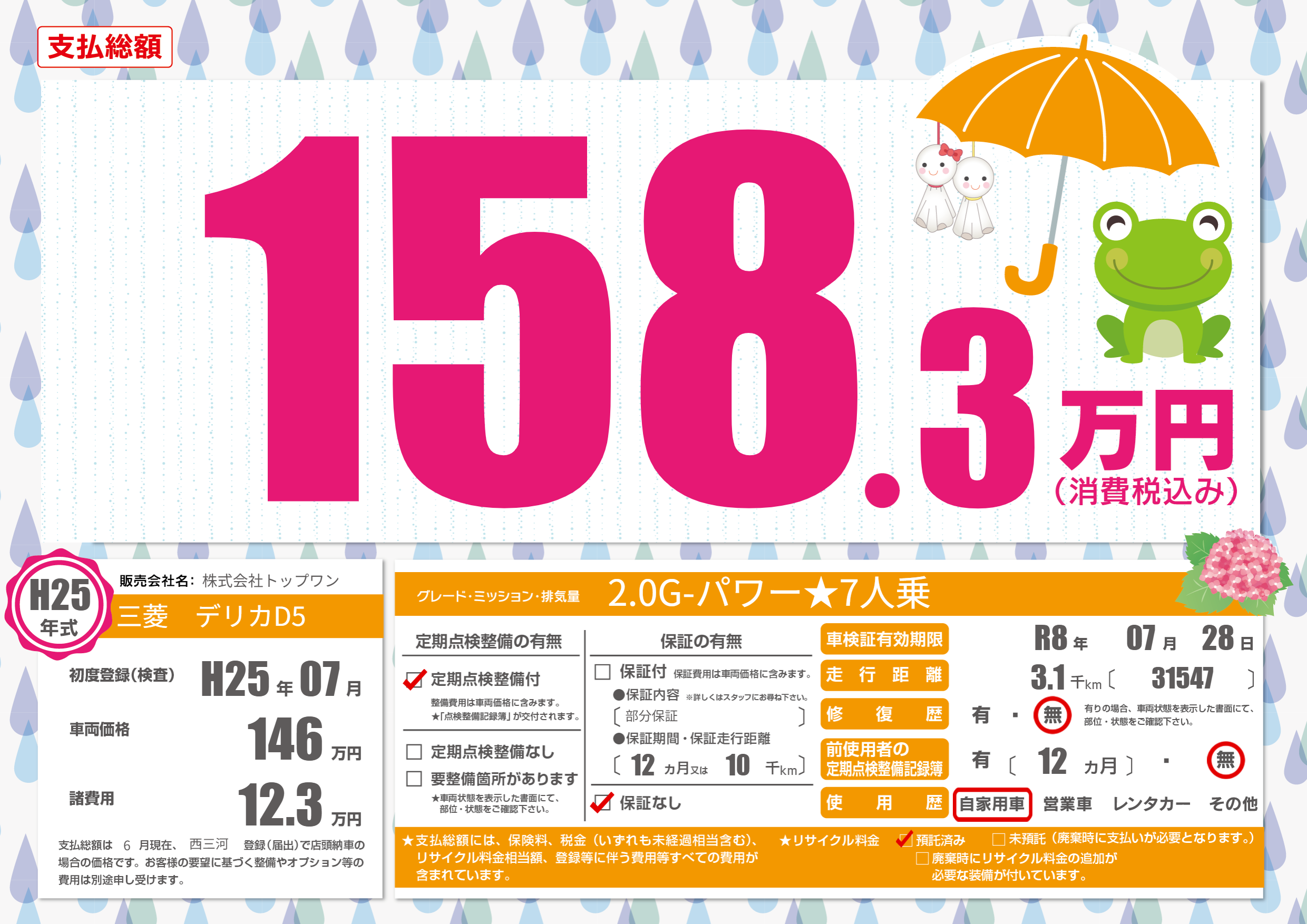 | 走行キロ | 0.3万km | 初年度登録 | H25年07月 |