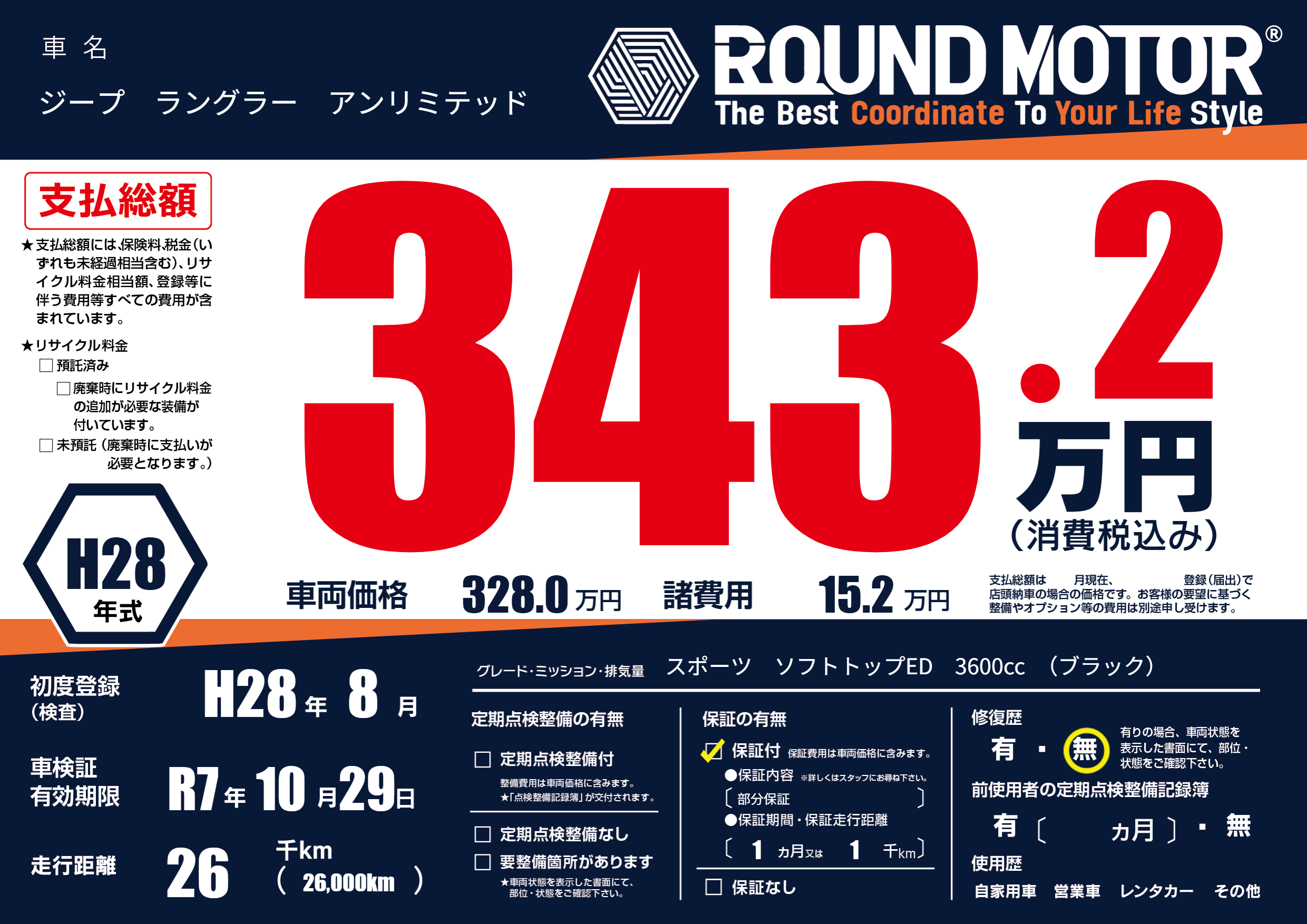 | 車名 | ジープ ラングラー アンリミテッド | グレード ミッション 排気量 |