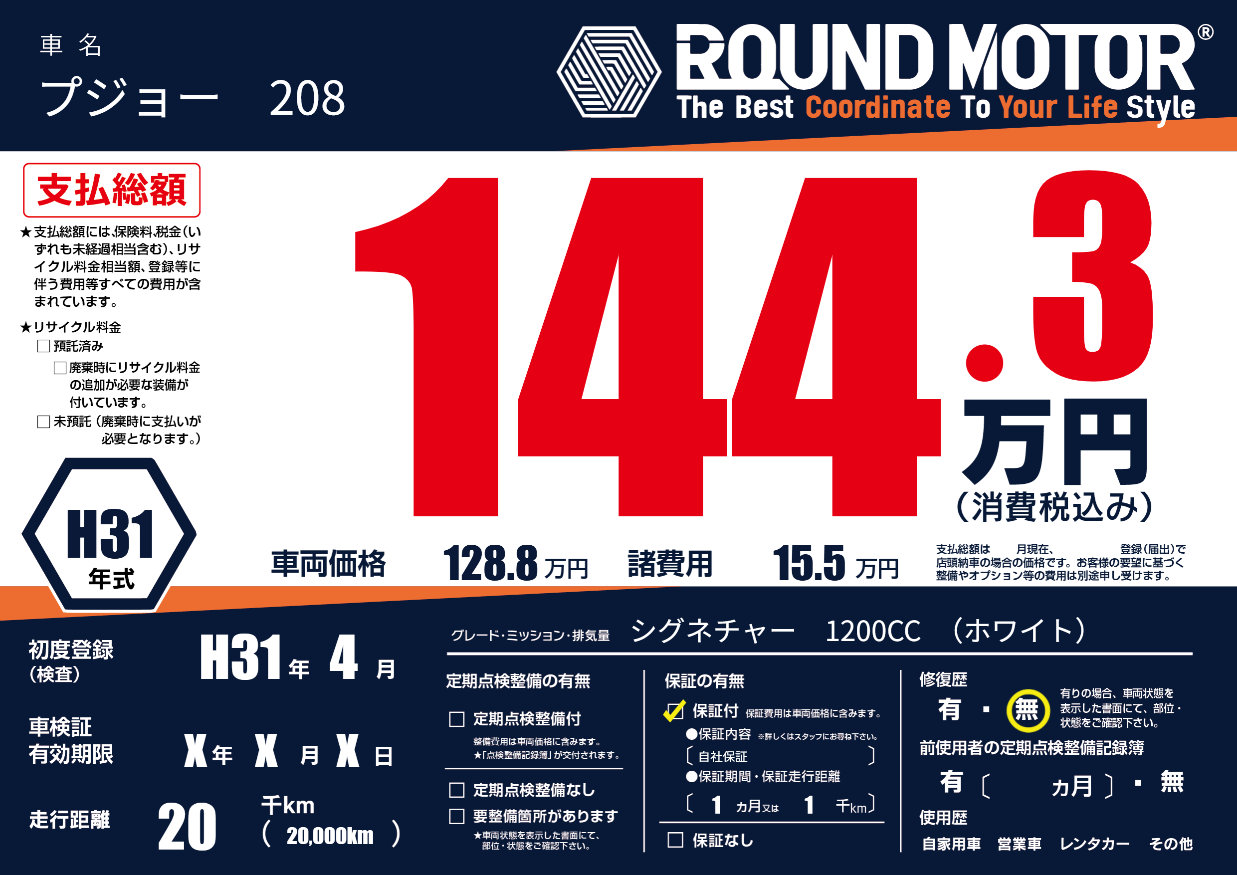 | 車名 | プジョー 208 | グレード ミッション 排気量 |