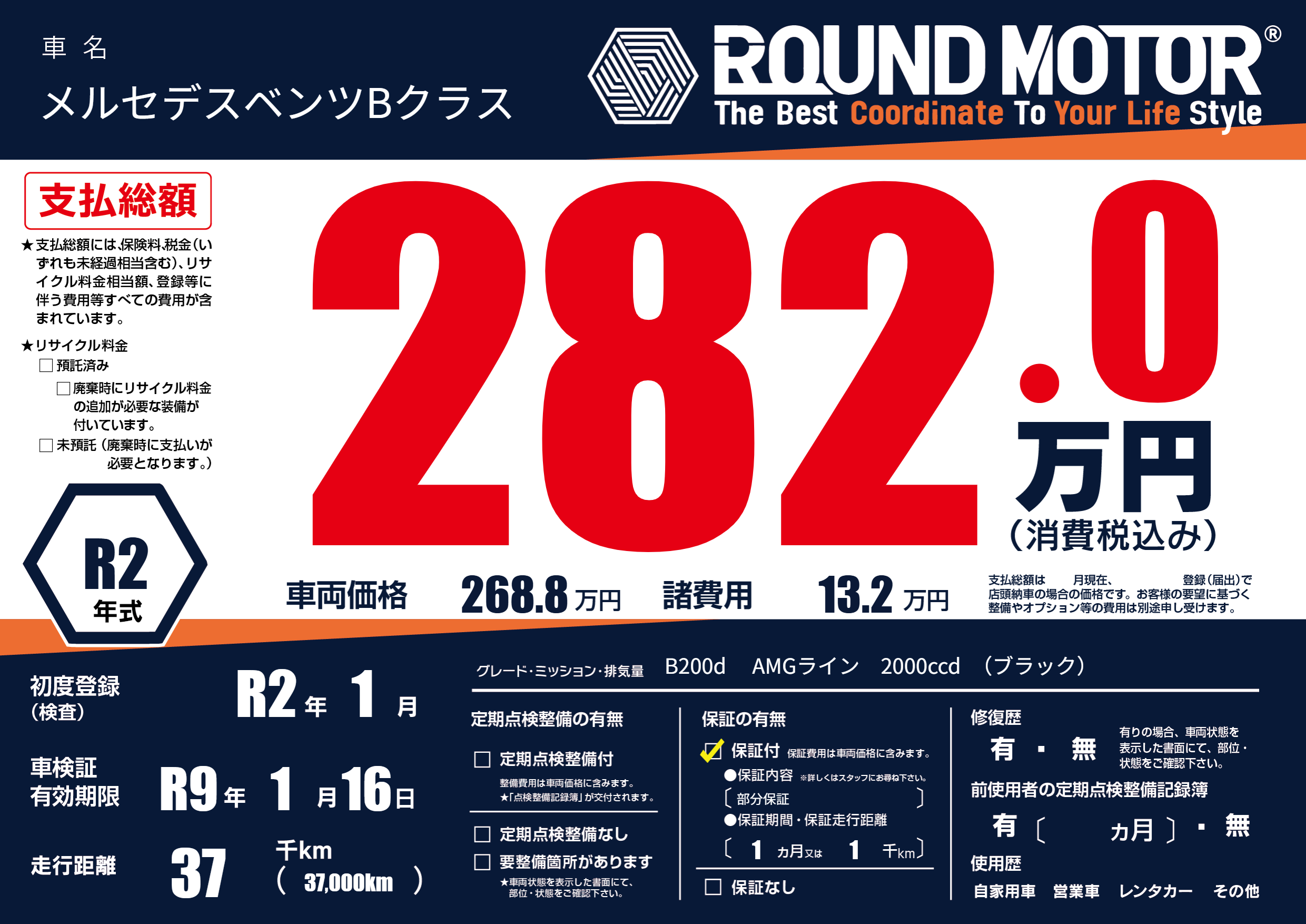 | 車名 | メルセデスベンツBクラス | グレード ミッション 排気量 |