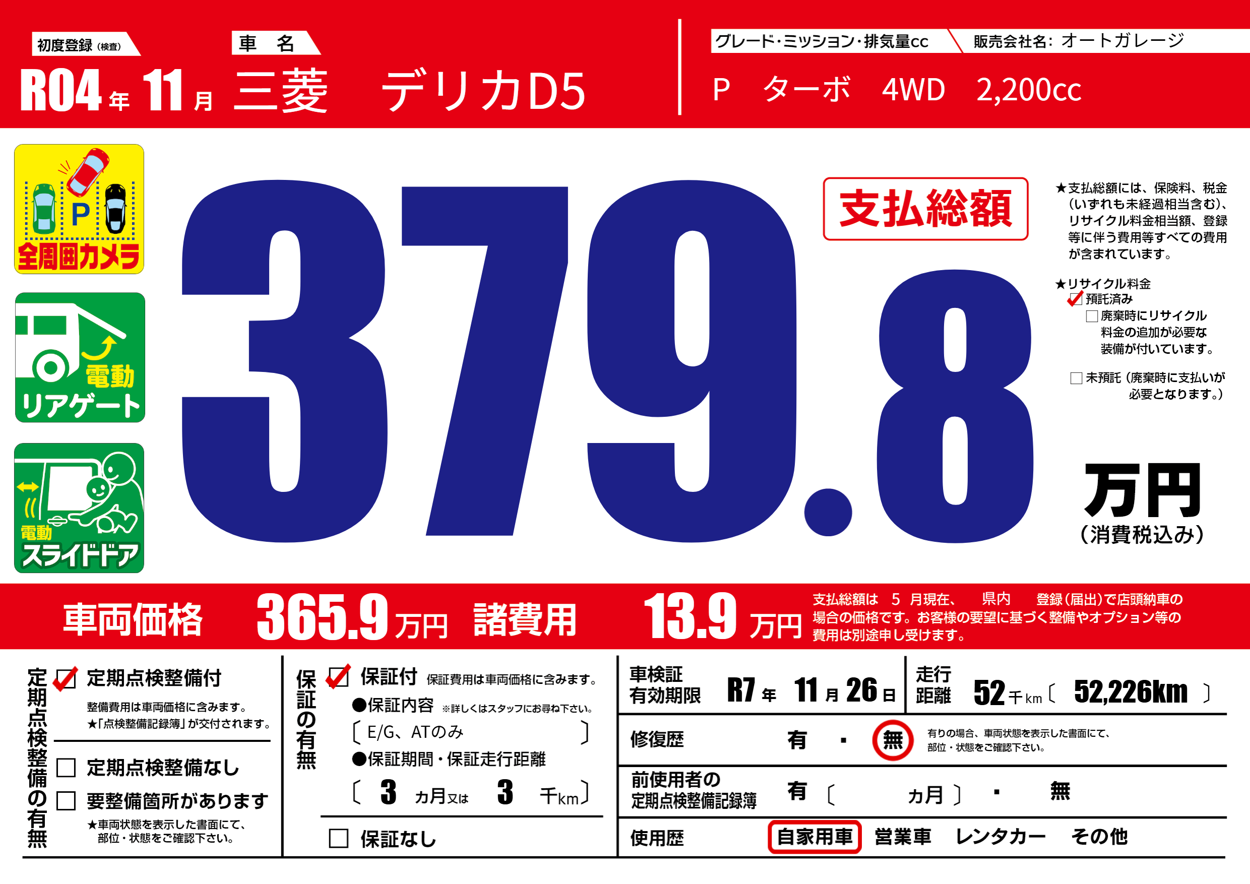 | 車名 | 三菱 デリカD5 | グレード ミッション 排気量 |