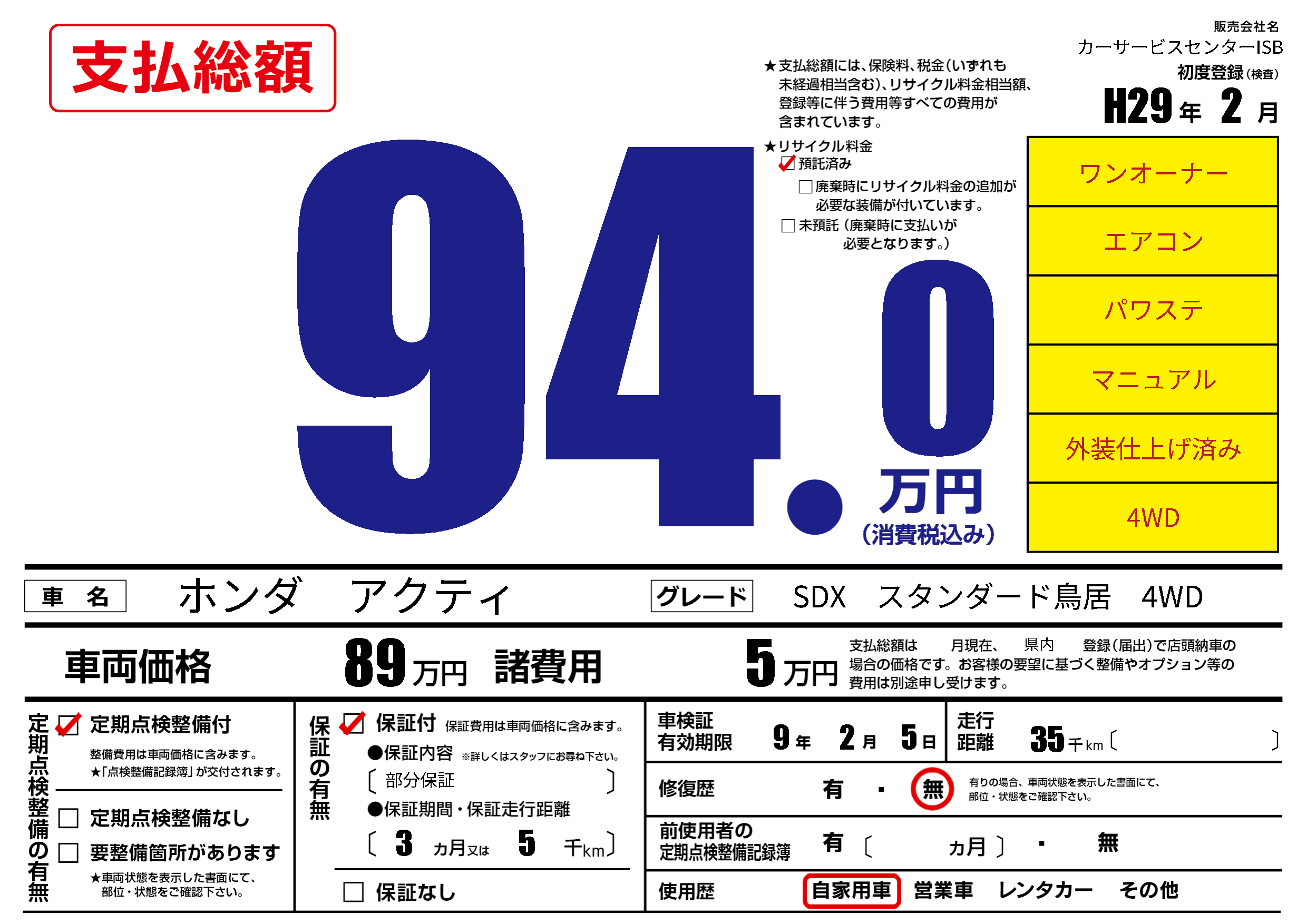 保証付き 保証内容(部分保証) 3ヶ月または(5)千kmまで |