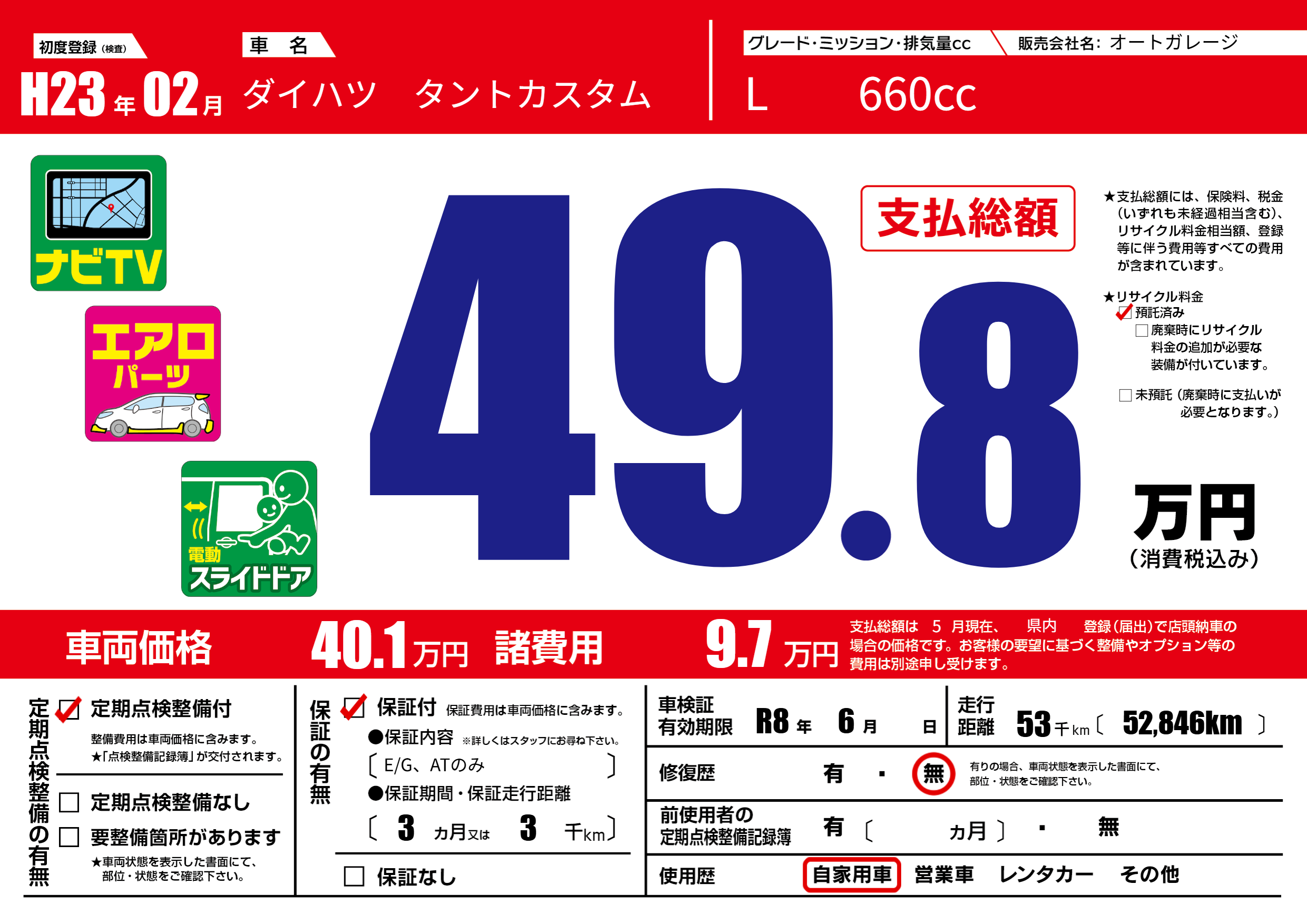 | 車名 | ダイハツ タントカスタム | グレード ミッション 排気量 |