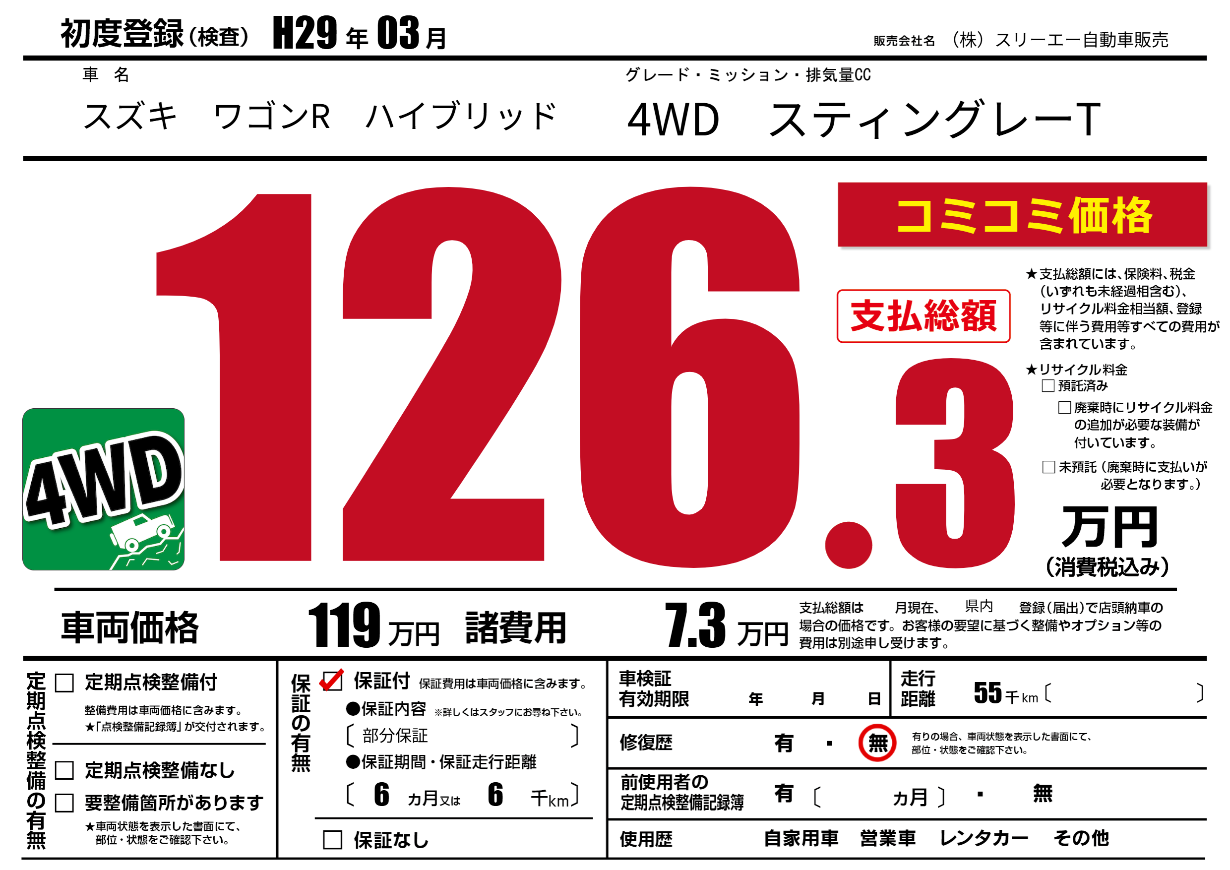 保証付き 保証内容(部分保証) 6ヶ月または(6)千kmまで |
