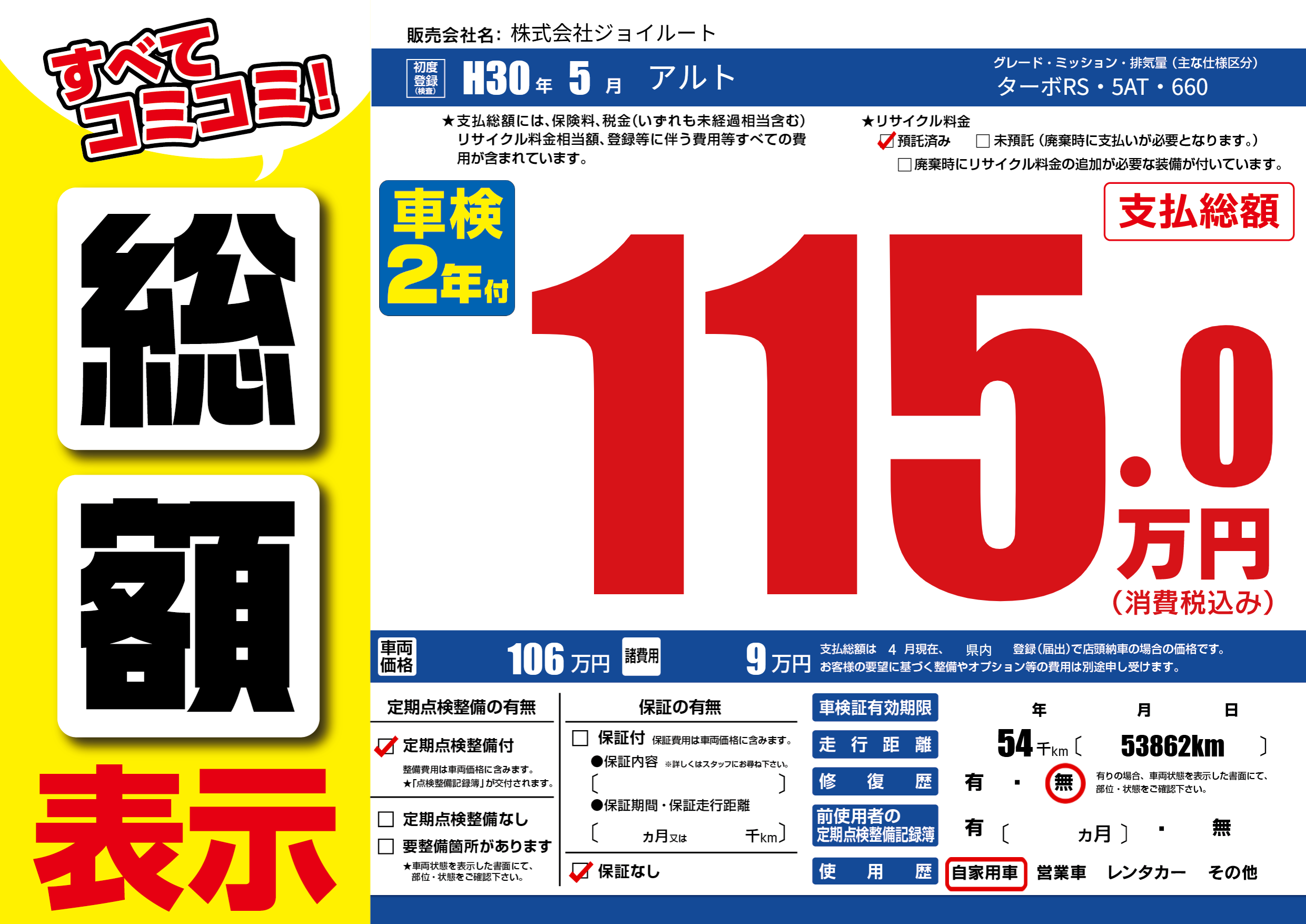| 走行キロ | 5.4万km | 初年度登録 | H30年5月 |
