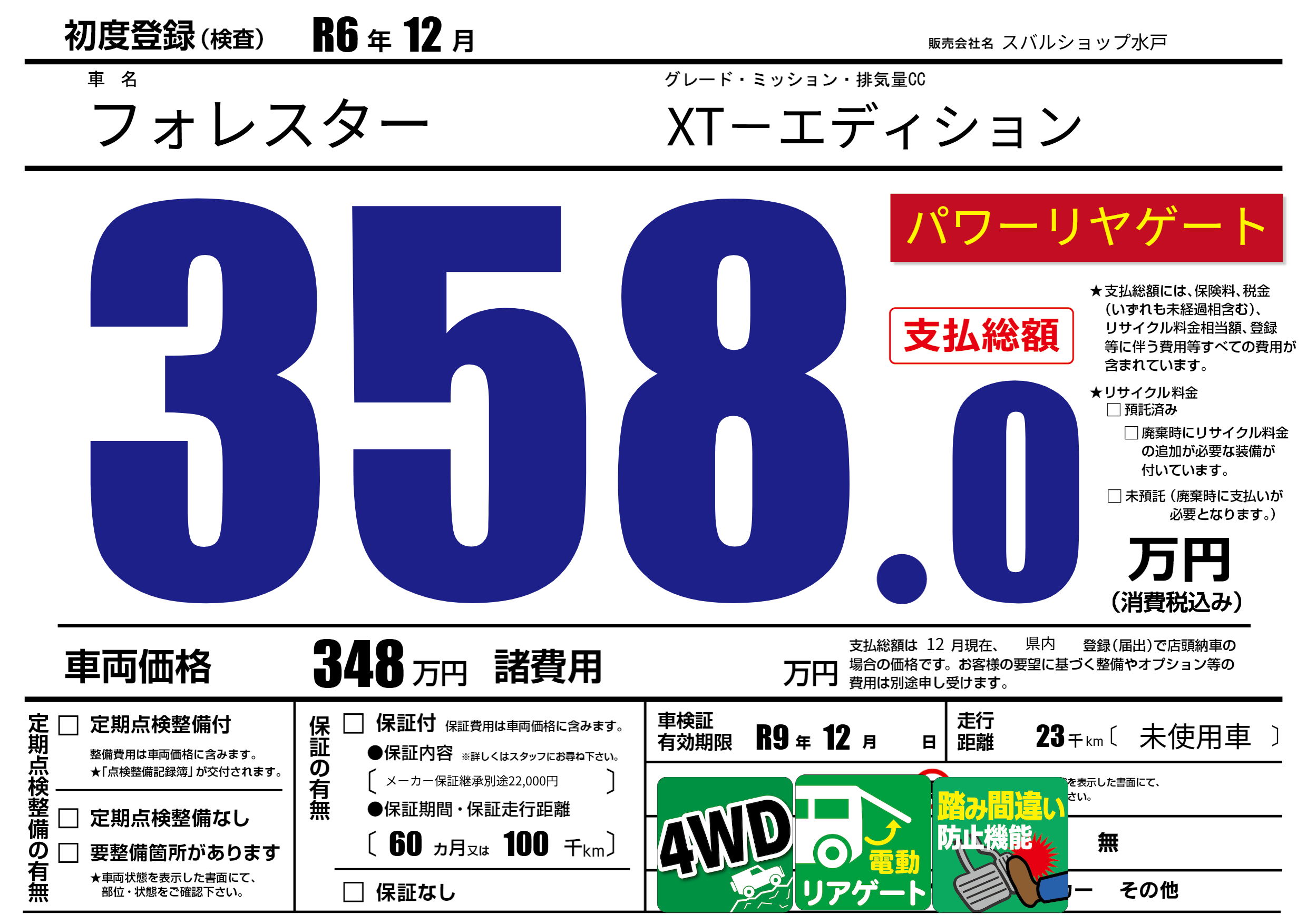 | 車名 | フォレスター | グレード ミッション 排気量 |