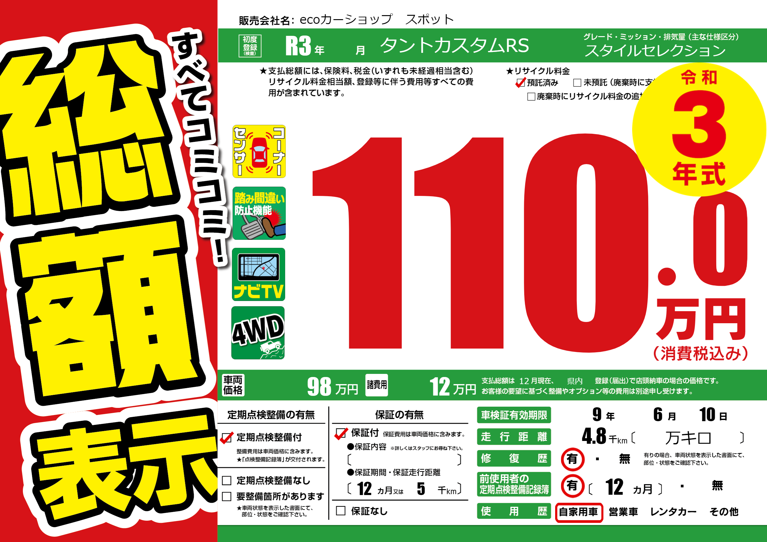 | 車名 | タントカスタムRS | グレード ミッション 排気量 |