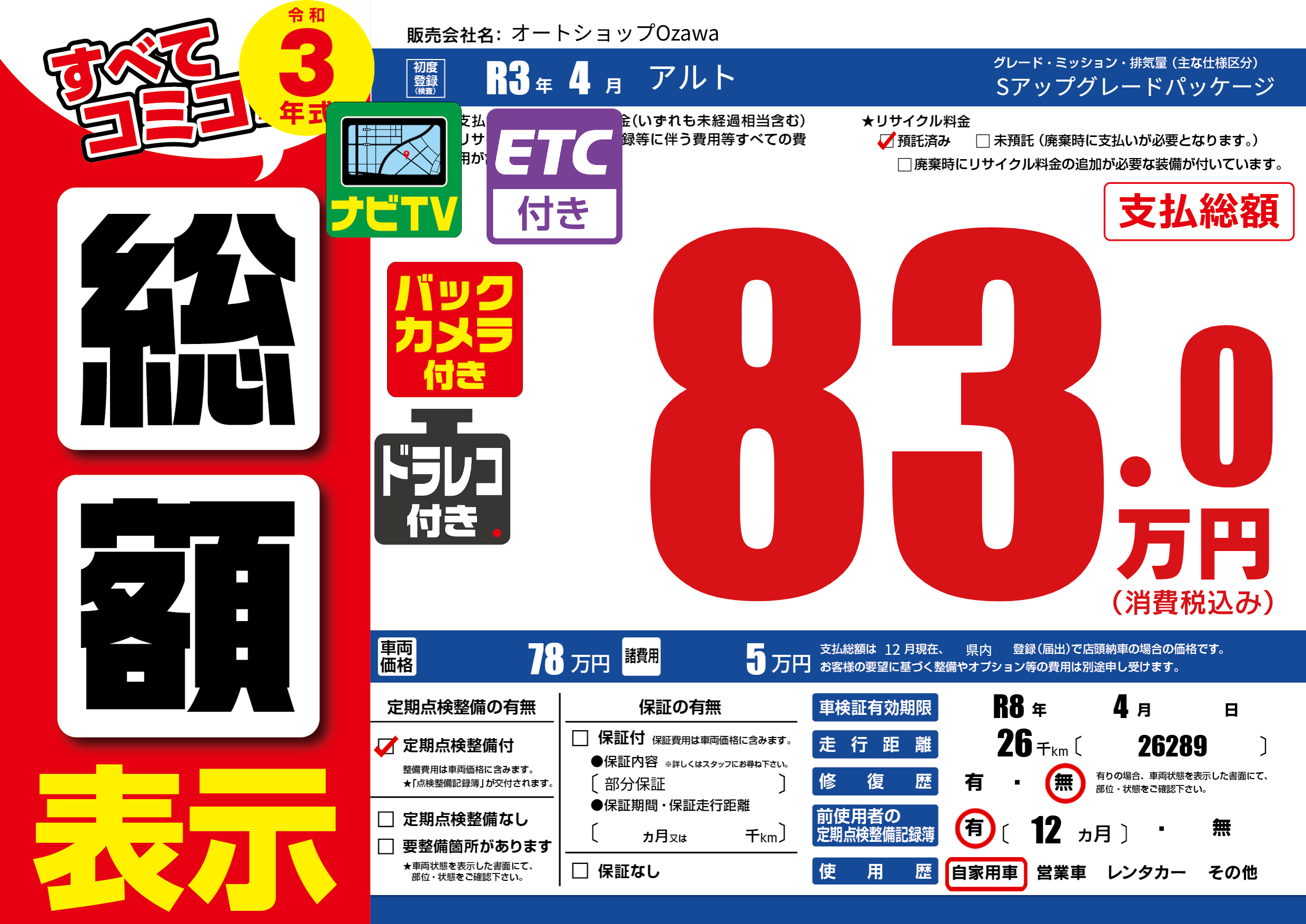 | 走行キロ | 2.6万km | 初年度登録 | R3年4月 |