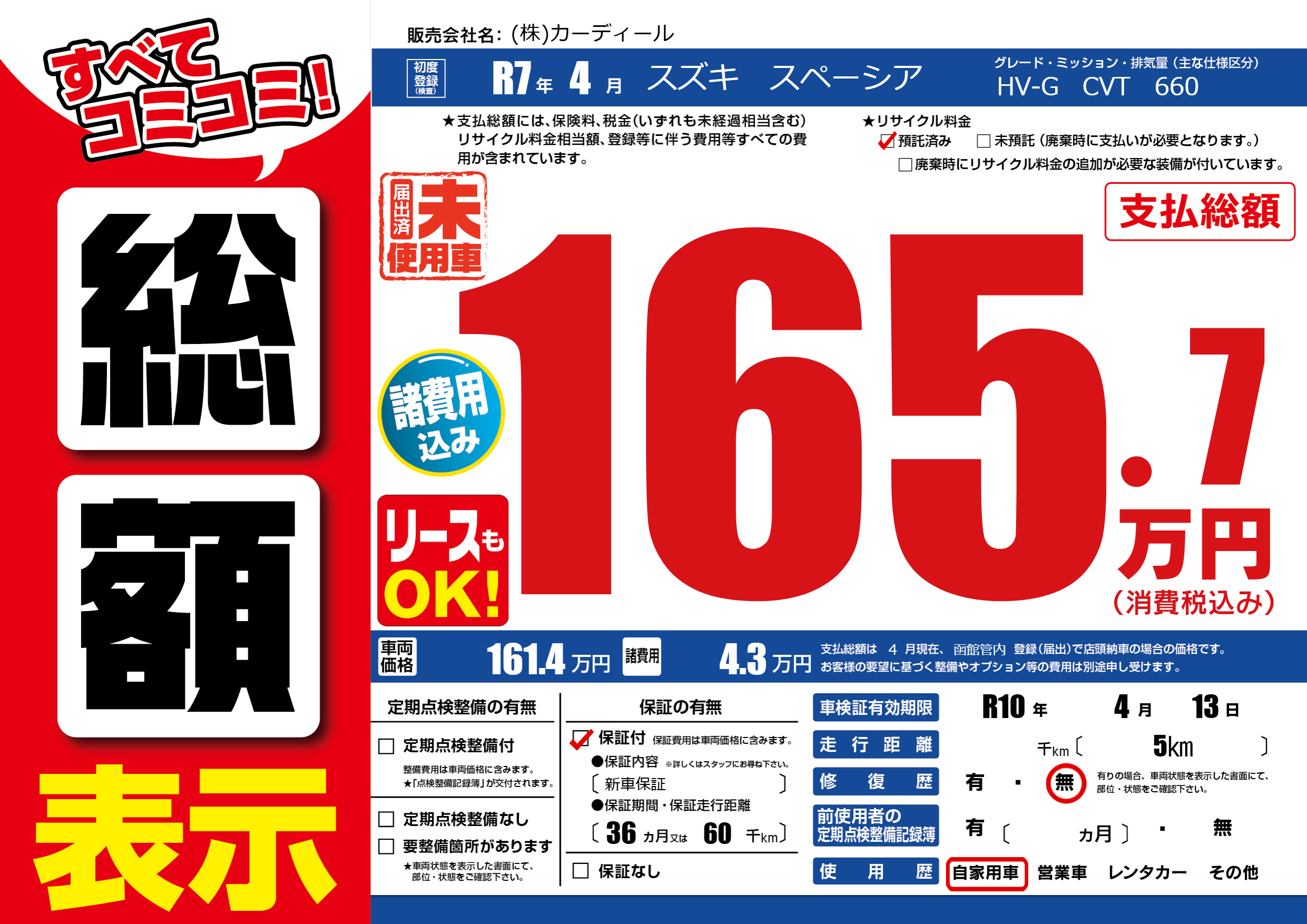 | 走行キロ | - | 初年度登録 | R7年4月 |