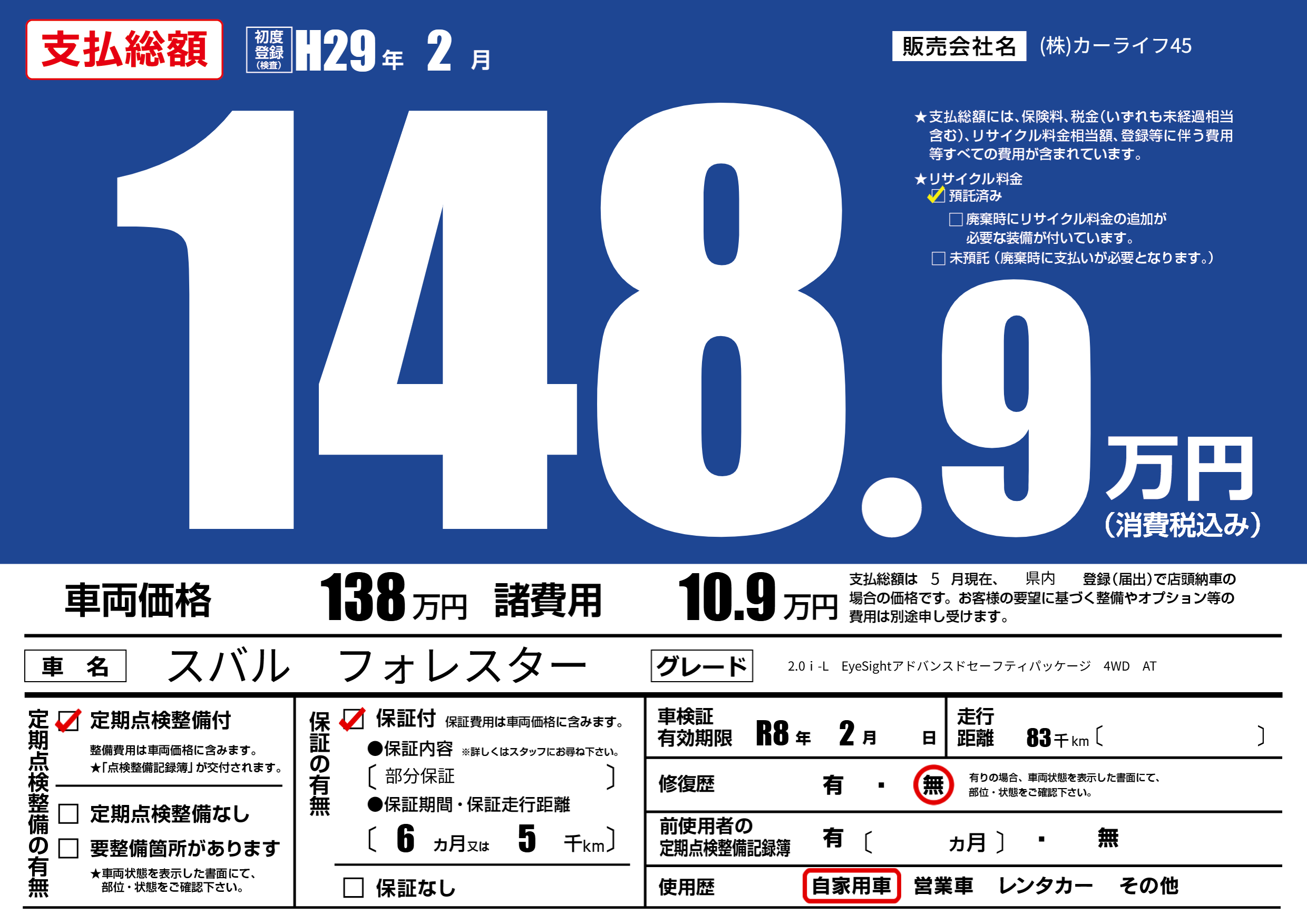 | 車名 | スバル フォレスター | グレード ミッション 排気量 |