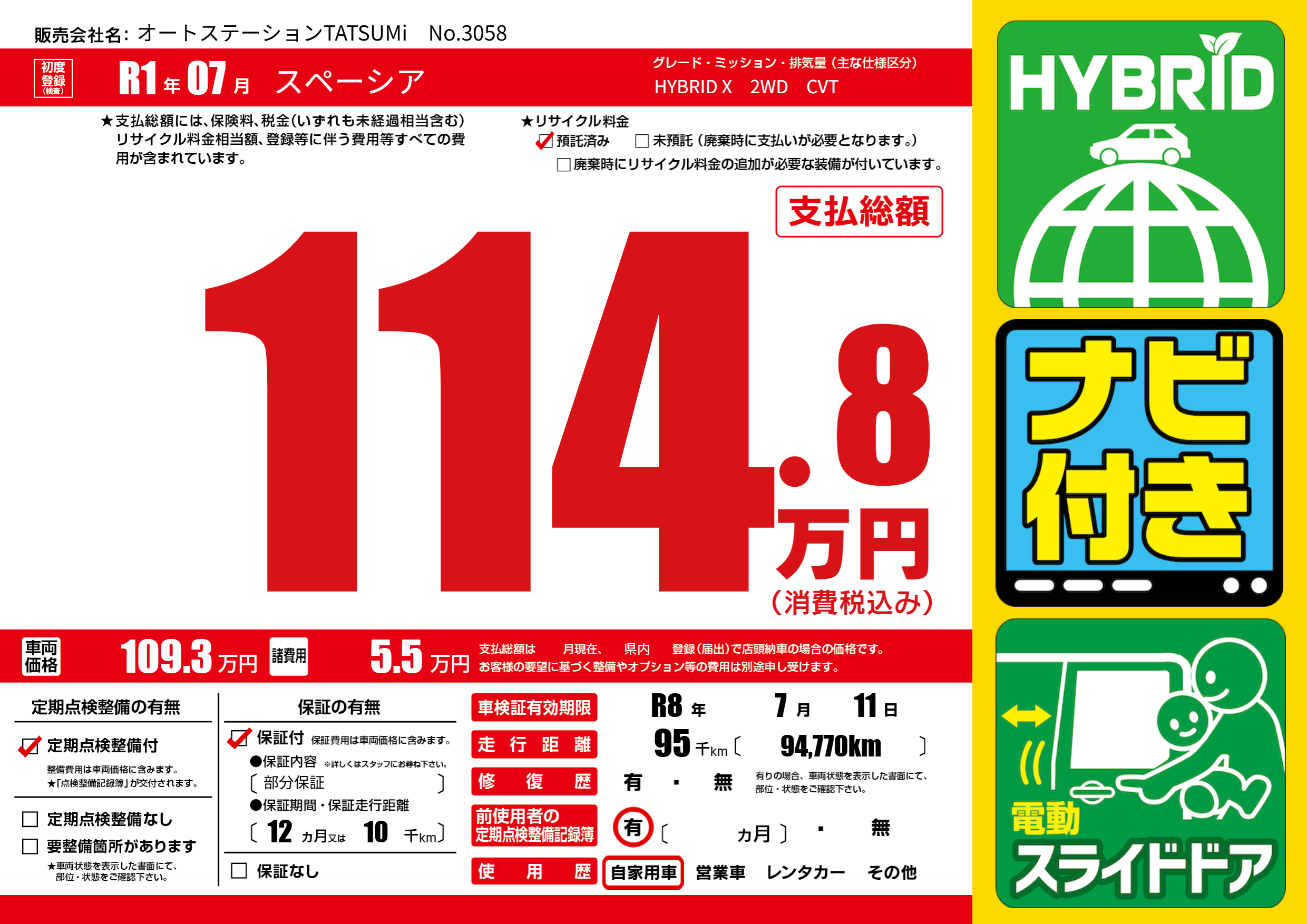 | 走行キロ | 9.5万km | 初年度登録 | R1年07月 |