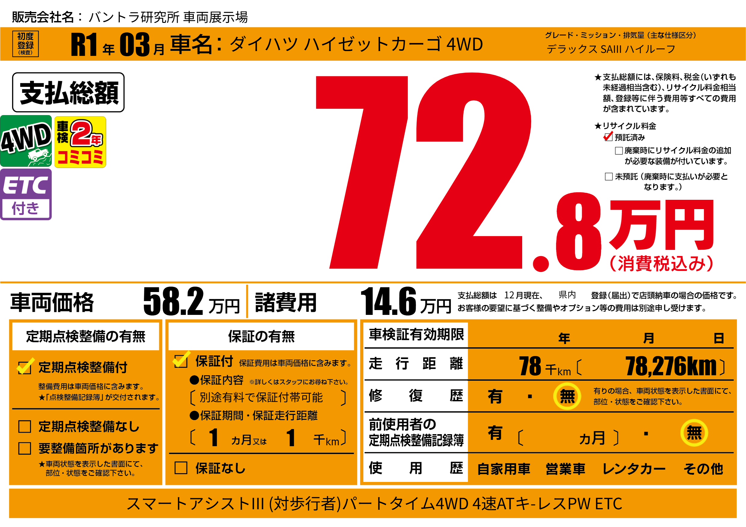 | 車名 | ダイハツ ハイゼットカーゴ 4WD | グレード ミッション 排気量 |