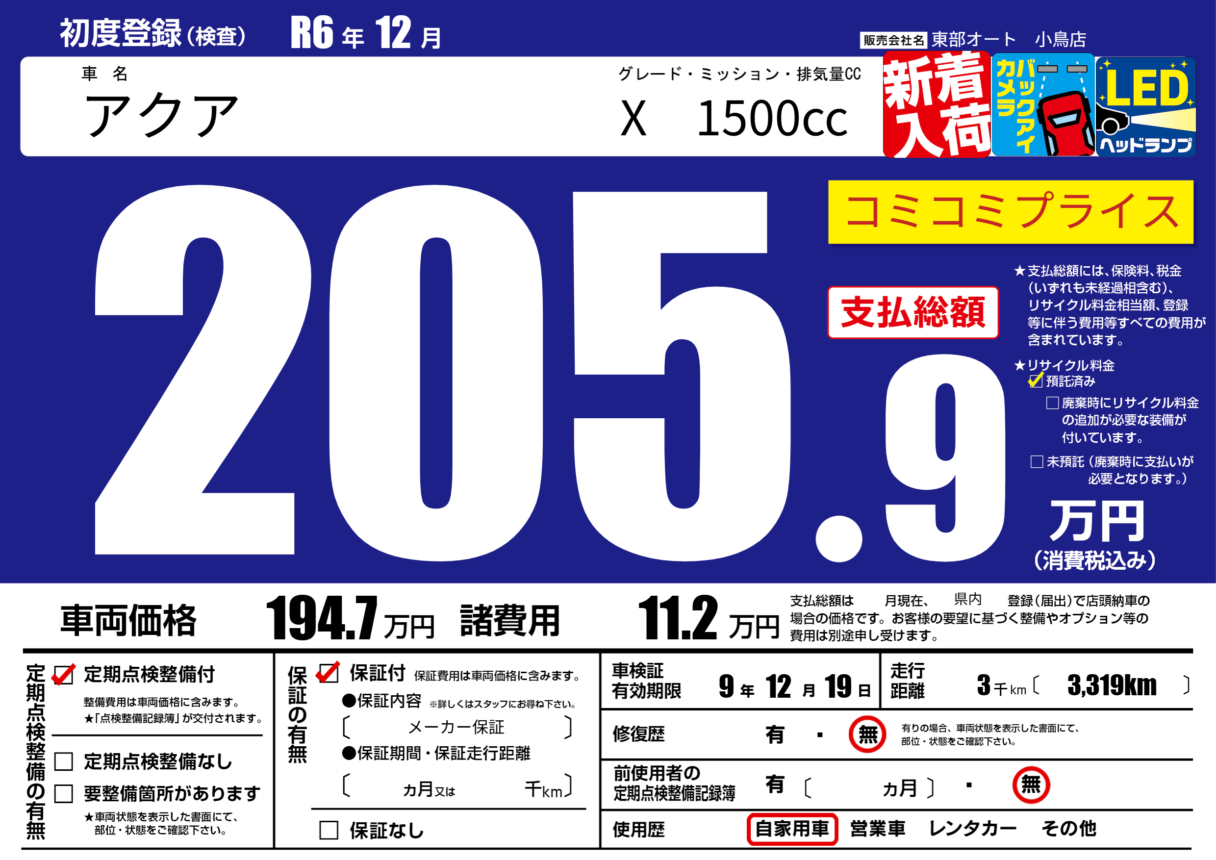 | 走行キロ | 0.3万km | 初年度登録 | R6年12月 |