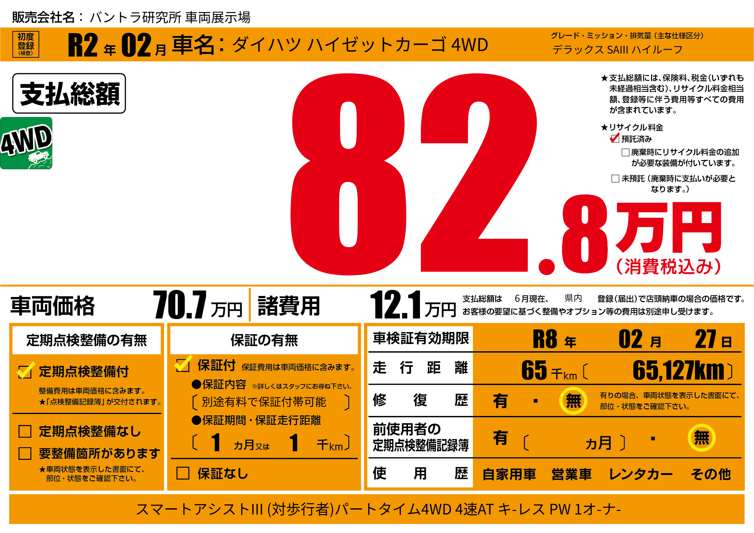 | 車名 | ダイハツ ハイゼットカーゴ 4WD | グレード ミッション 排気量 |