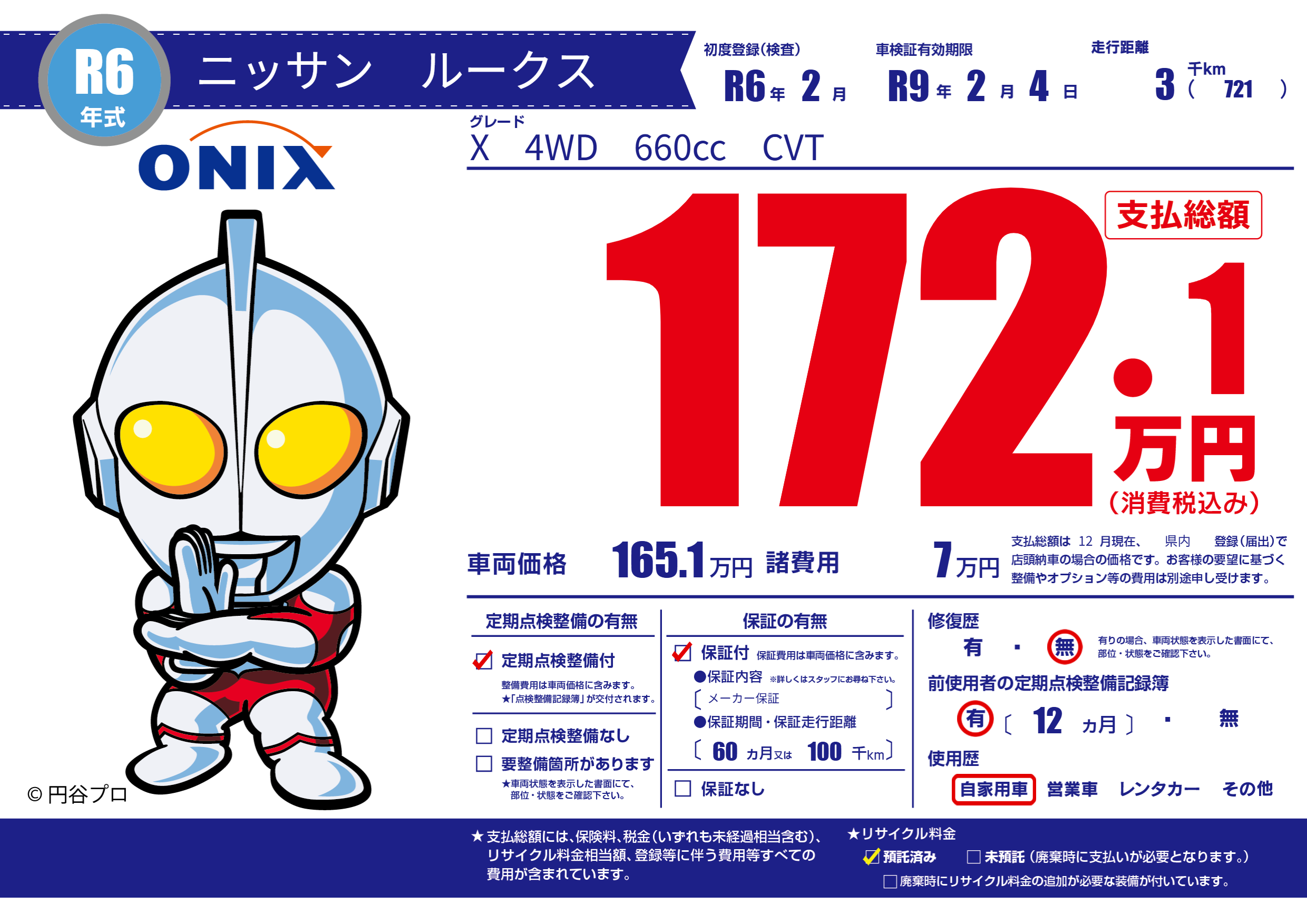 | 走行キロ | 0.3万km | 初年度登録 | R6年2月 |