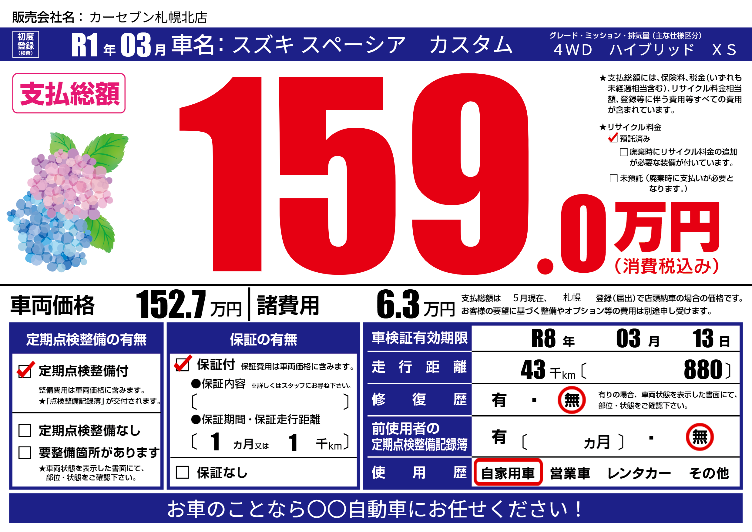 | 走行キロ | 4.3万km | 初年度登録 | R1年03月 |