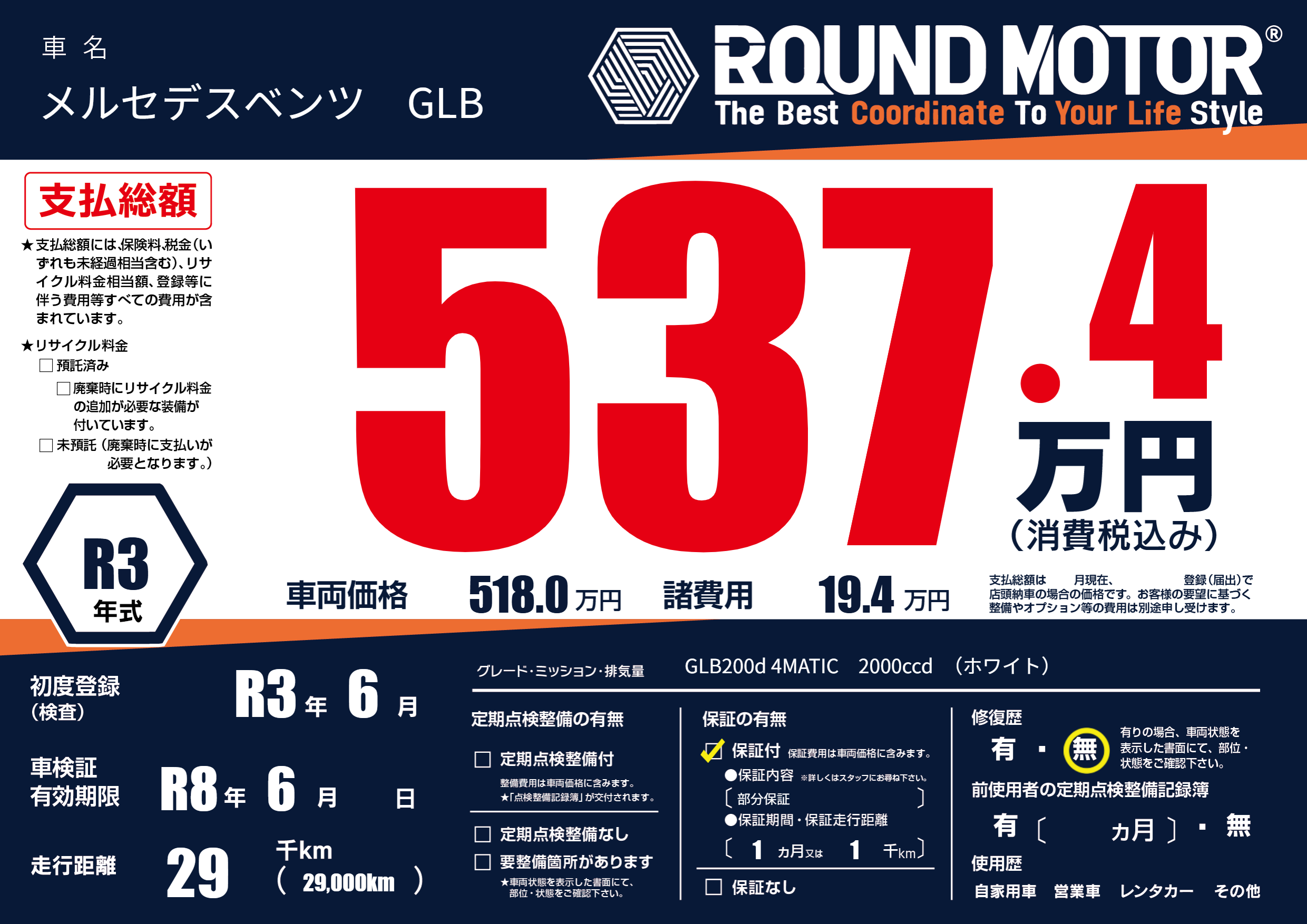 | 車名 | メルセデスベンツ GLB | グレード ミッション 排気量 |
