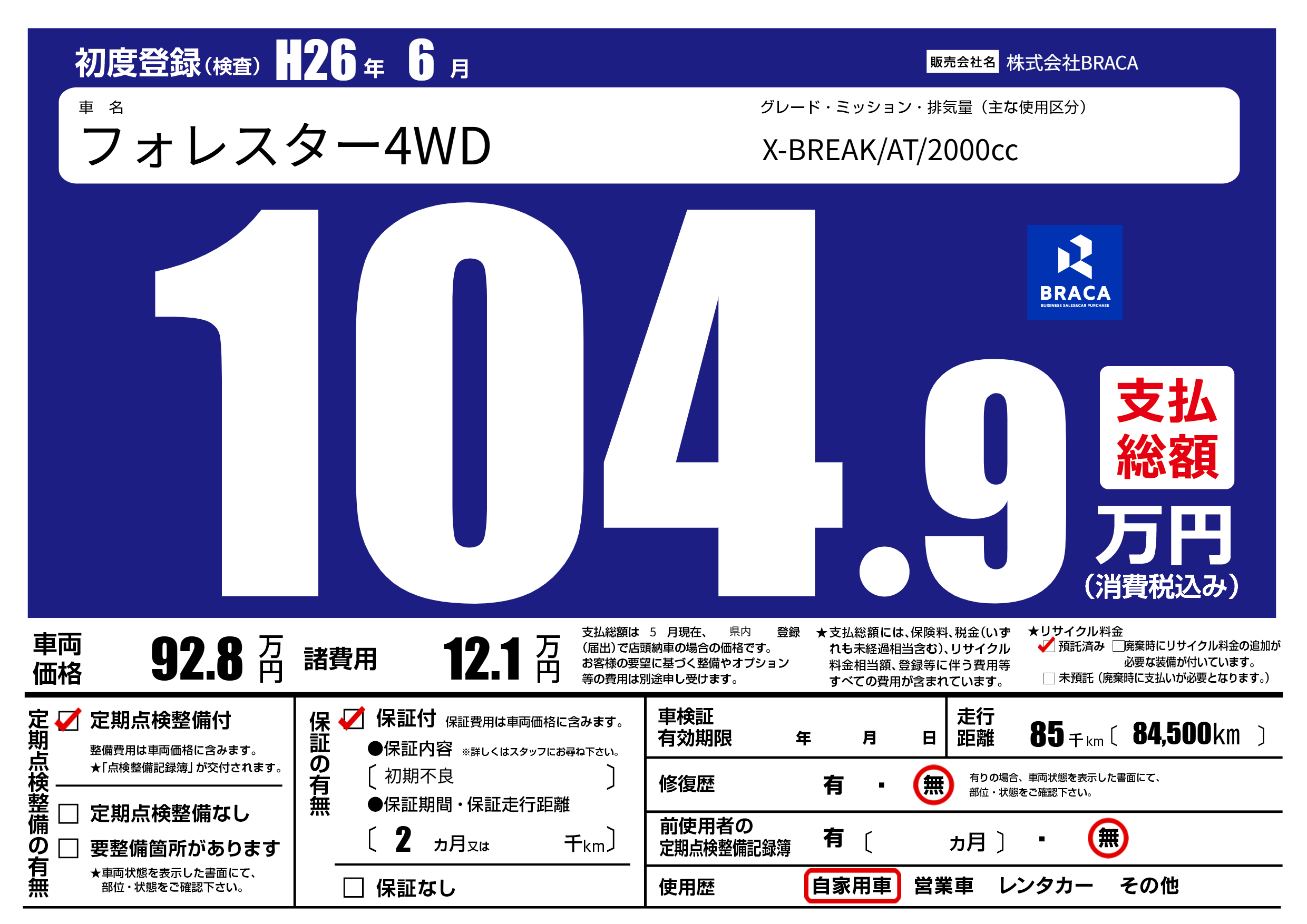 | 車名 | フォレスター4WD | グレード ミッション 排気量 |