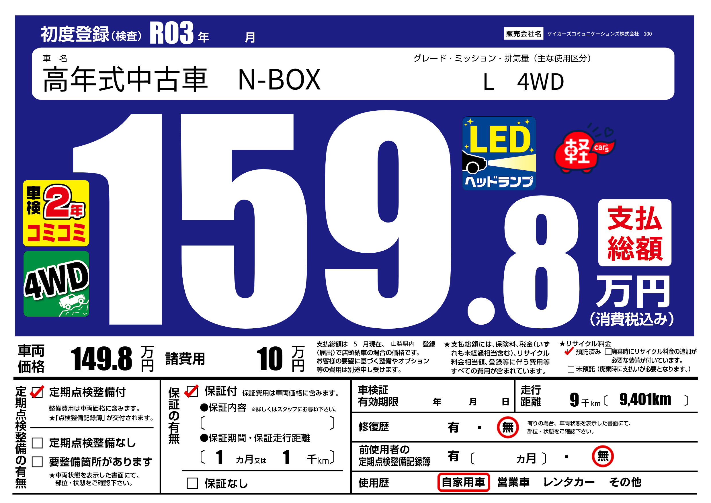 | 走行キロ | 0.9万km | 初年度登録 | R03年---月 |