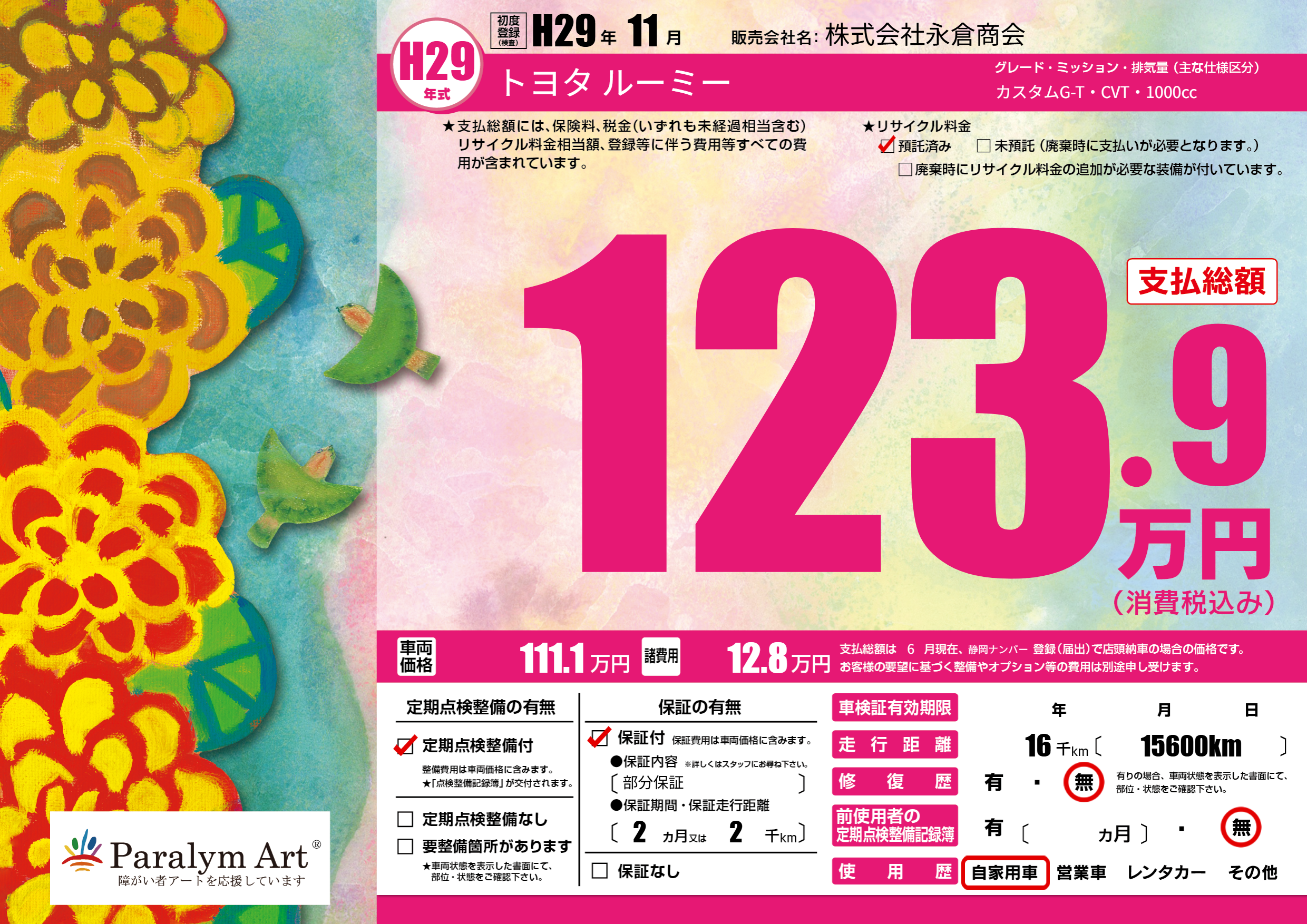 | 車名 | トヨタ ルーミー | グレード ミッション 排気量 |