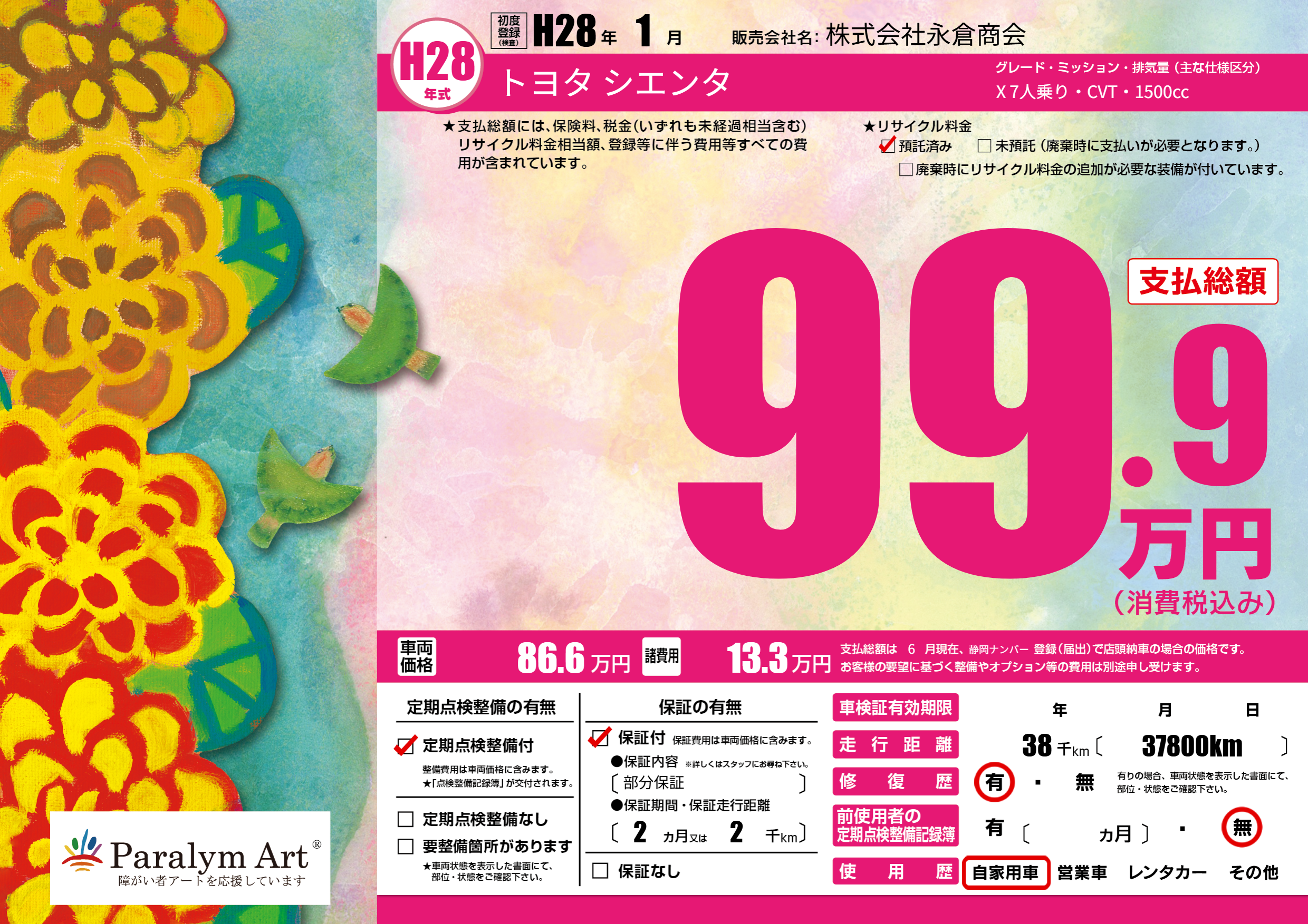 | 車名 | トヨタ シエンタ | グレード ミッション 排気量 |