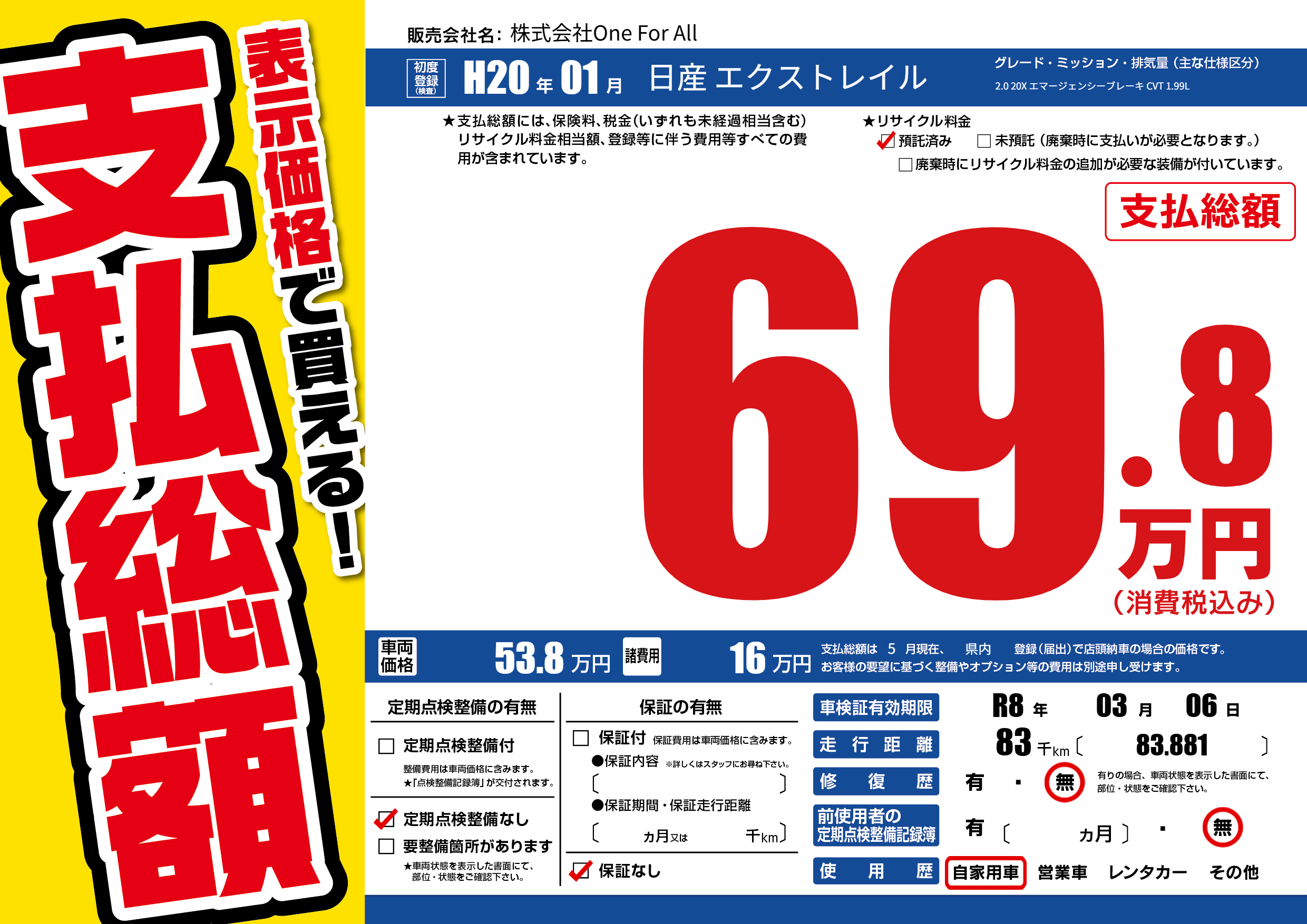 | 走行キロ | 8.3万km | 初年度登録 | H20年01月 |