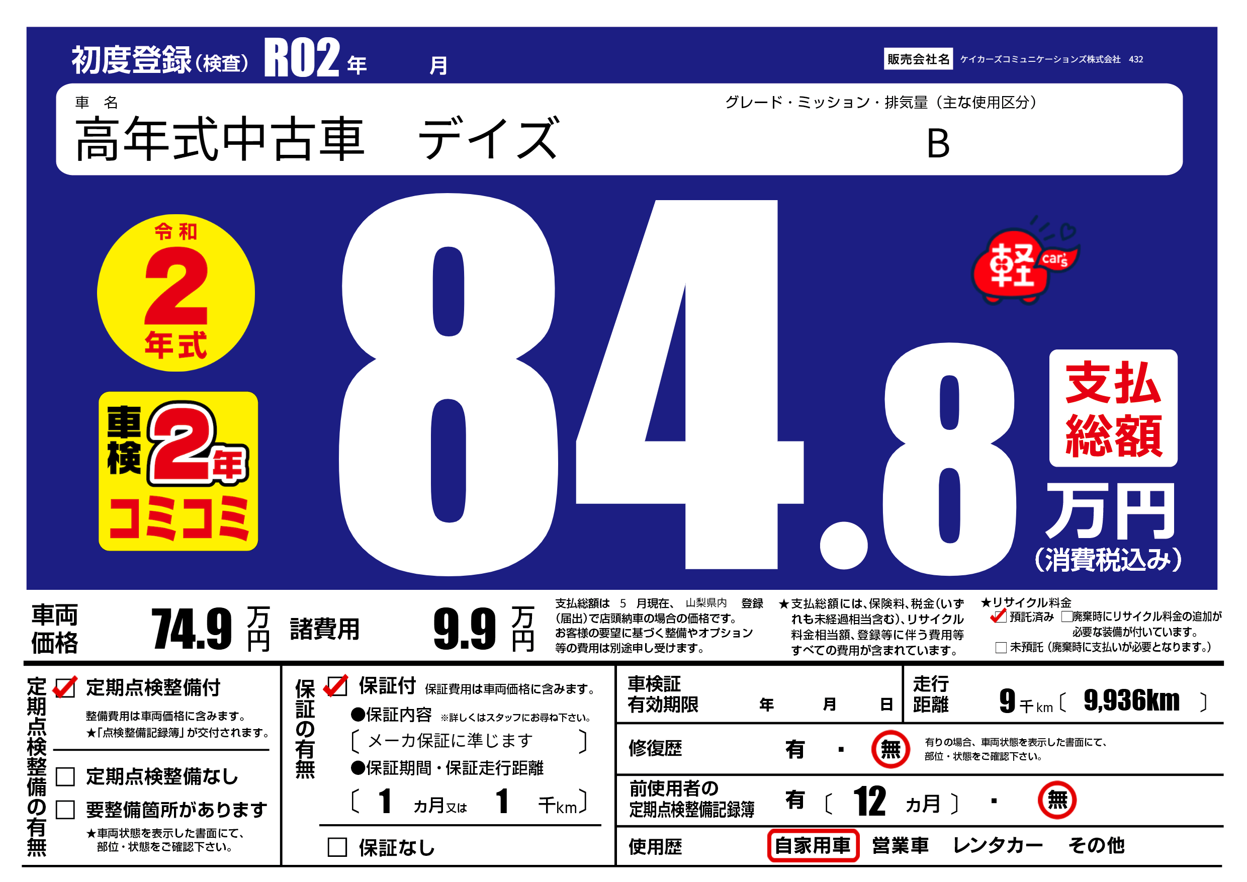 | 走行キロ | 0.9万km | 初年度登録 | R02年---月 |