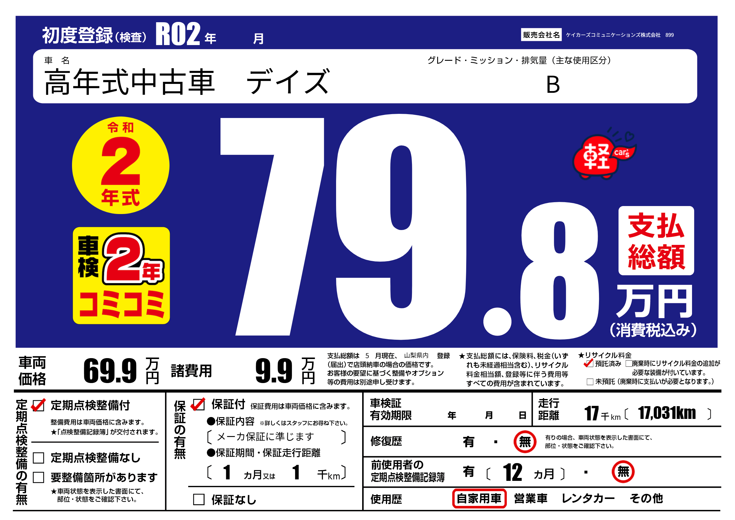 | 車名 | 高年式中古車 デイズ | グレード ミッション 排気量 |