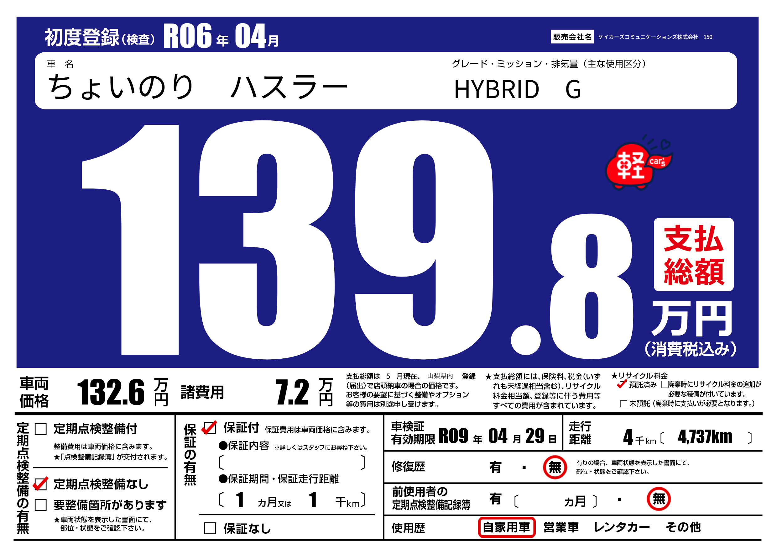 | 車名 | ちょいのり ハスラー | グレード ミッション 排気量 |
