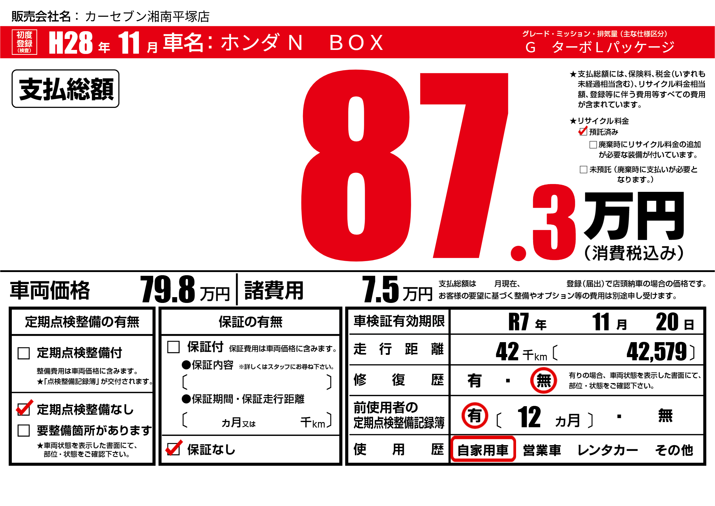 | 車名 | ホンダ N BOX | グレード ミッション 排気量 |