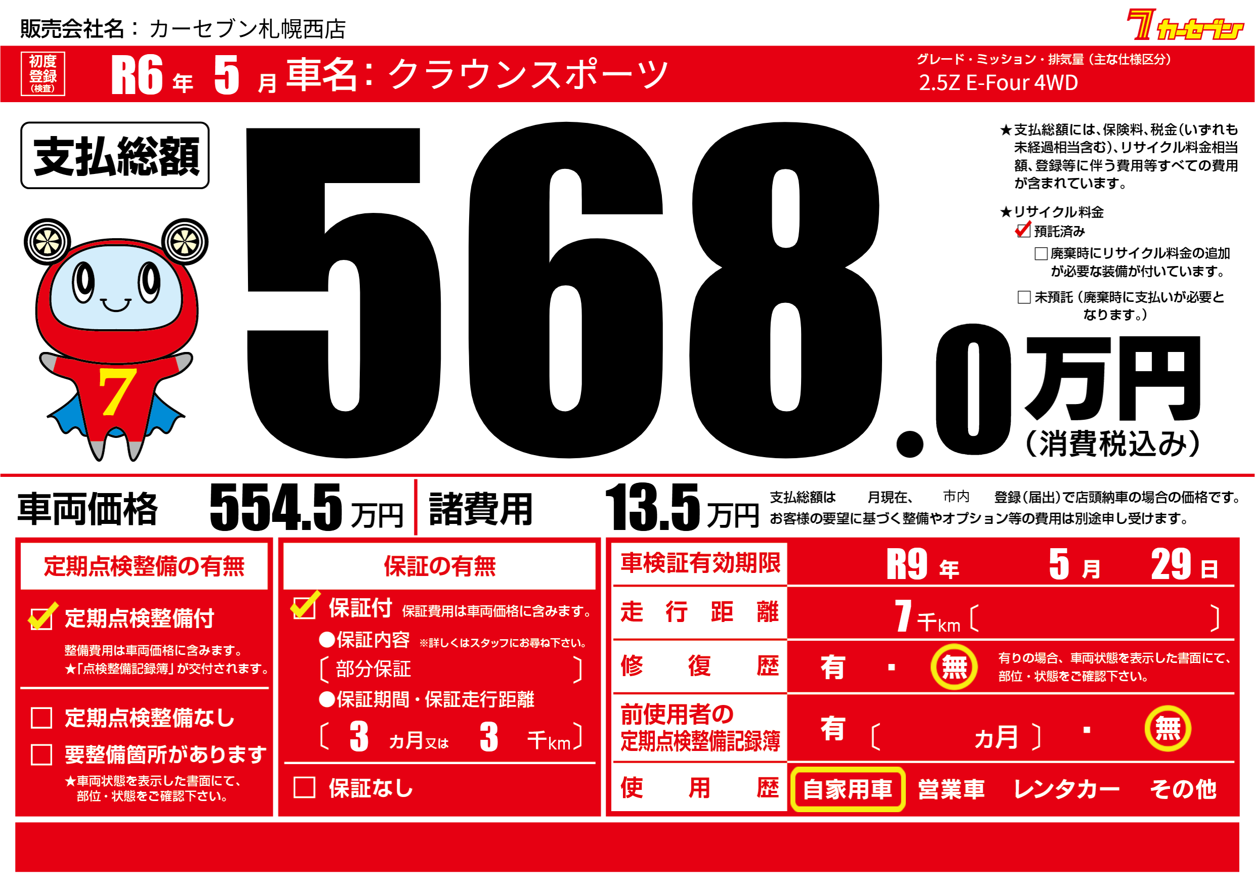 | 走行キロ | 0.7万km | 初年度登録 | R6年5月 |