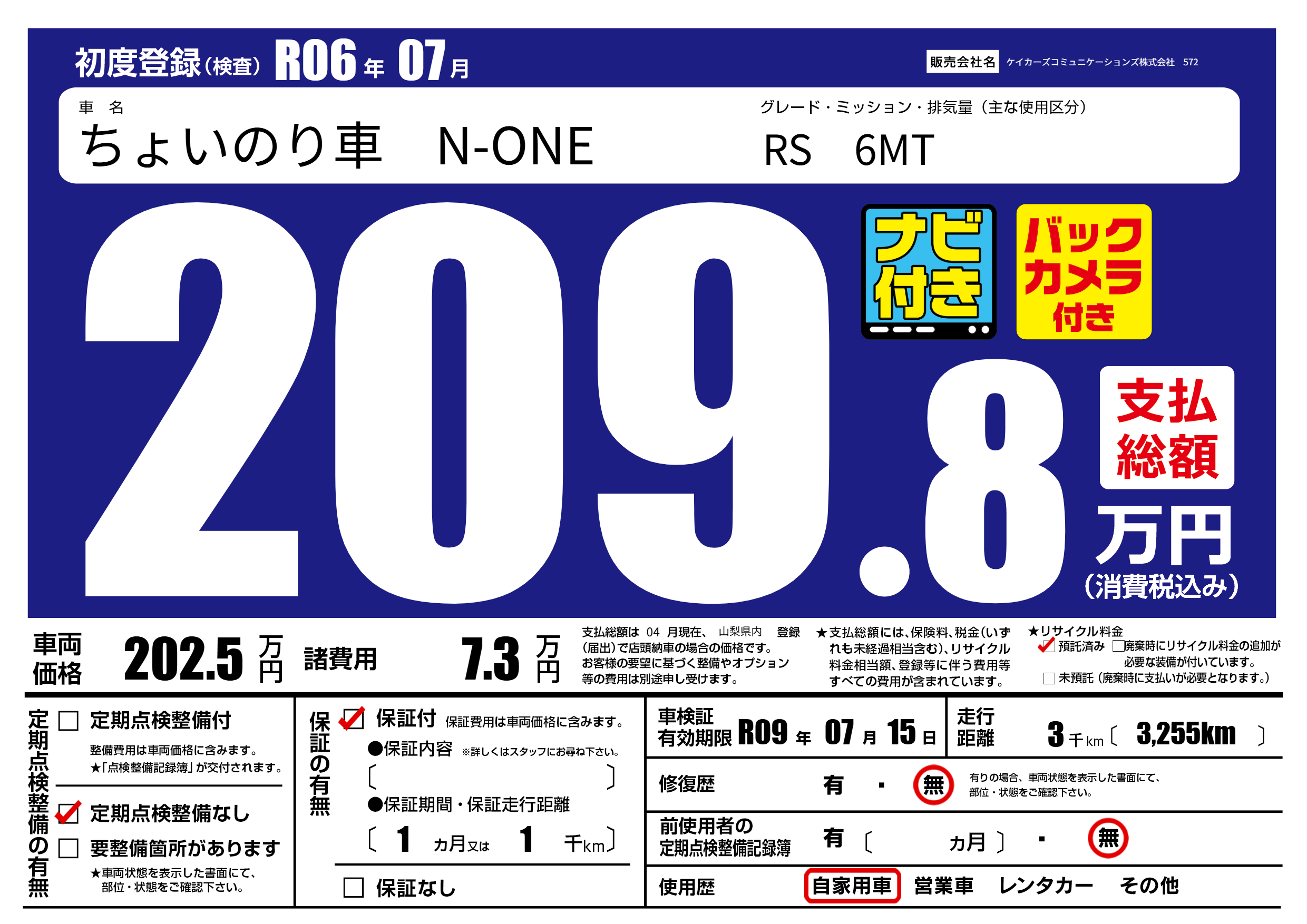 | 車名 | ちょいのり車 N-ONE | グレード ミッション 排気量 |