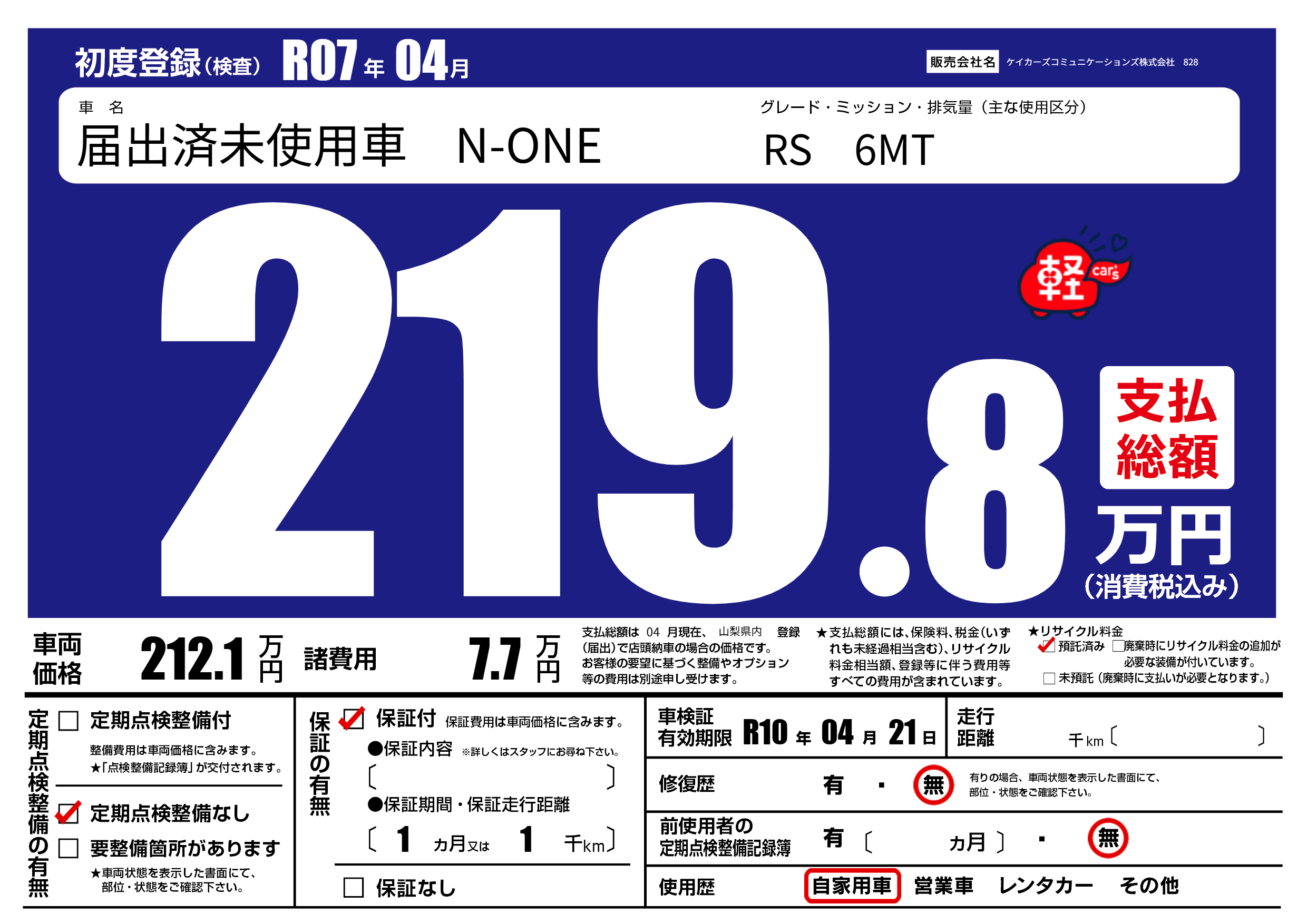 | 車名 | 届出済未使用車 N-ONE | グレード ミッション 排気量 |
