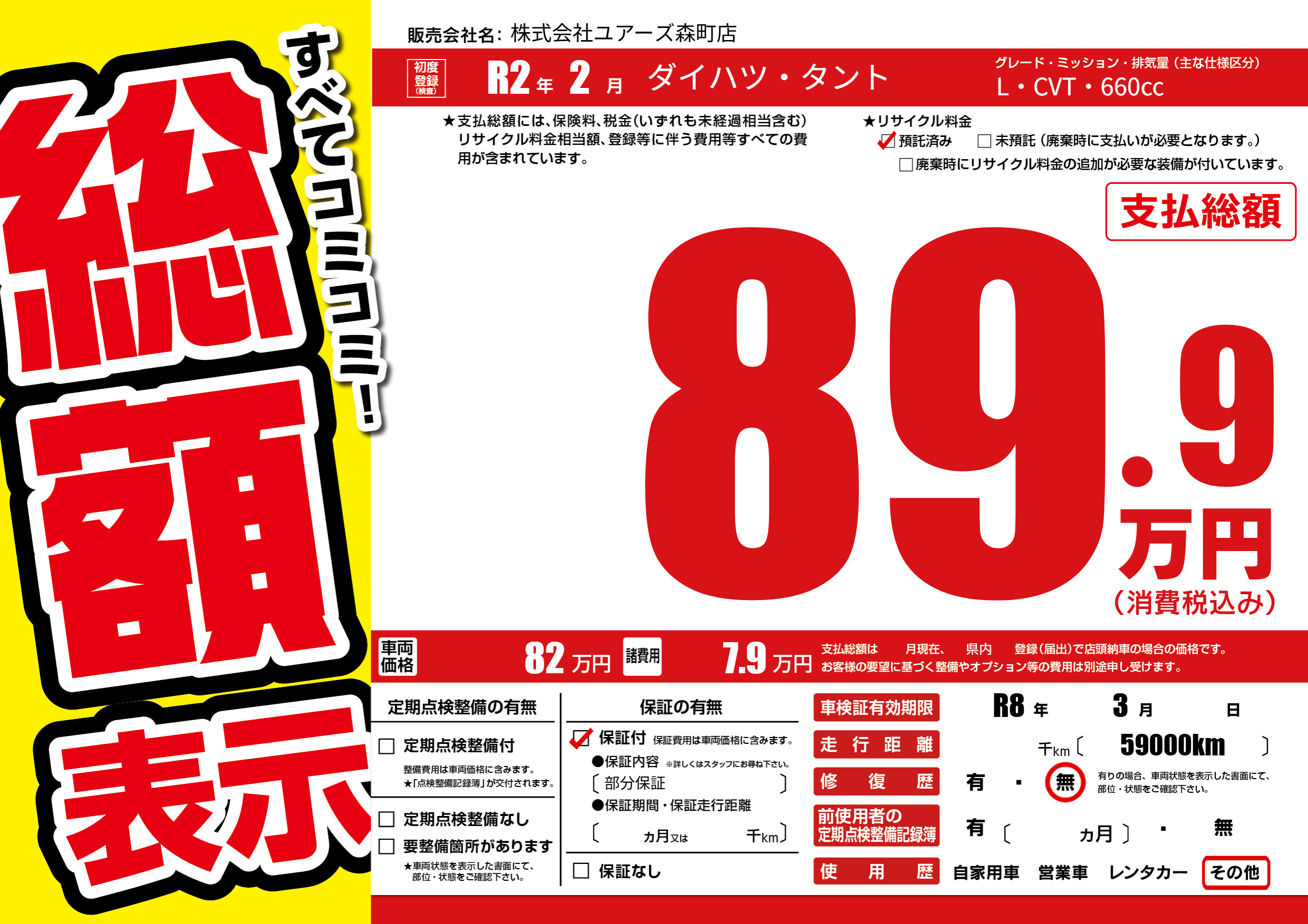 | 車名 | ダイハツ・タント | グレード ミッション 排気量 |