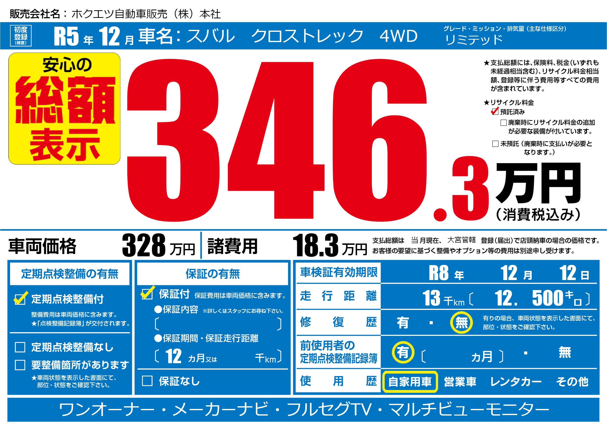 | 車名 | スバル クロストレック 4WD | グレード ミッション 排気量 |