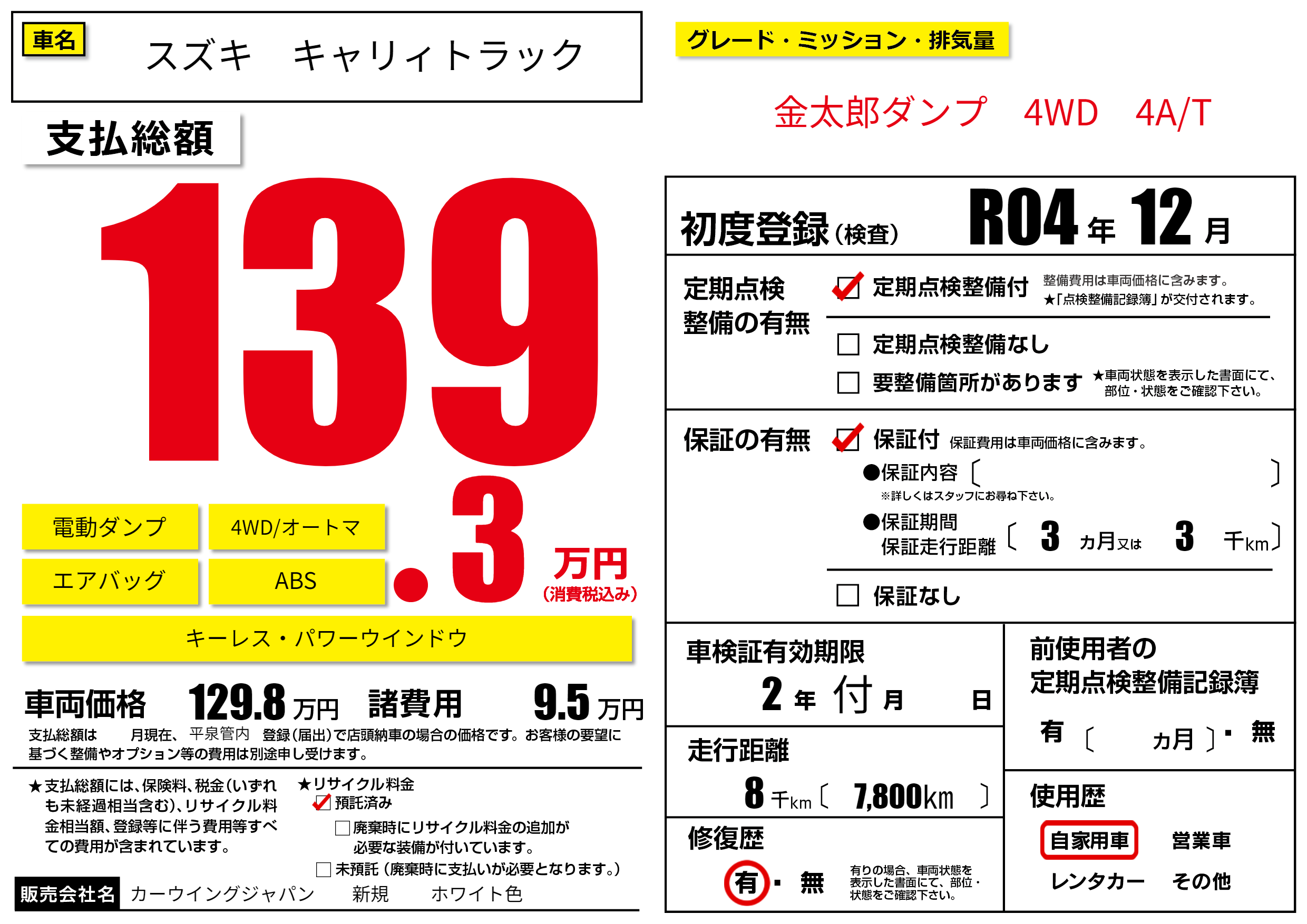 | 走行キロ | 0.8万km | 初年度登録 | R04年12月 |