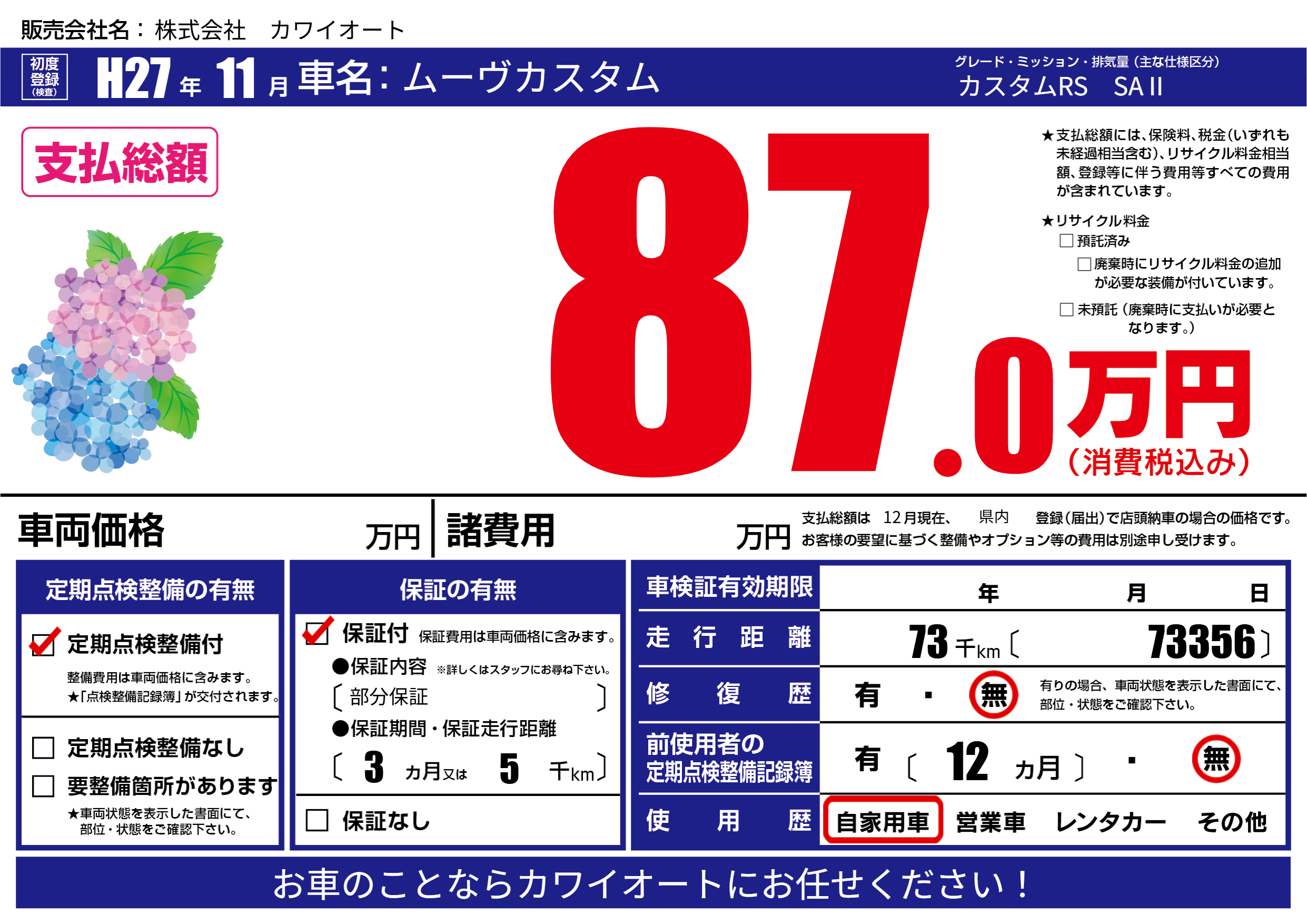 | 走行キロ | 7.3万km | 初年度登録 | H27年11月 |