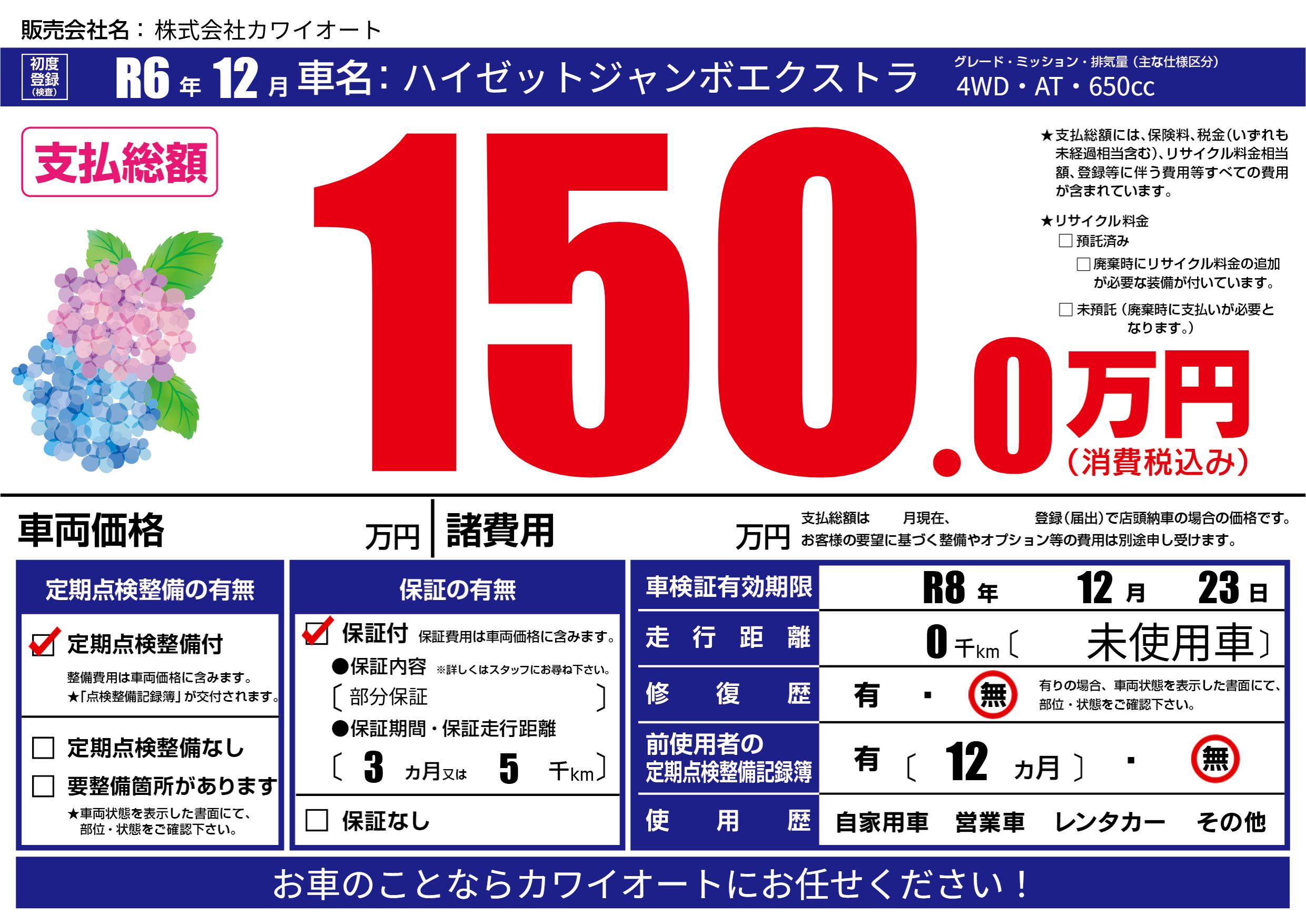 | 車名 | ハイゼットジャンボエクストラ | グレード ミッション 排気量 |